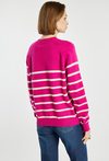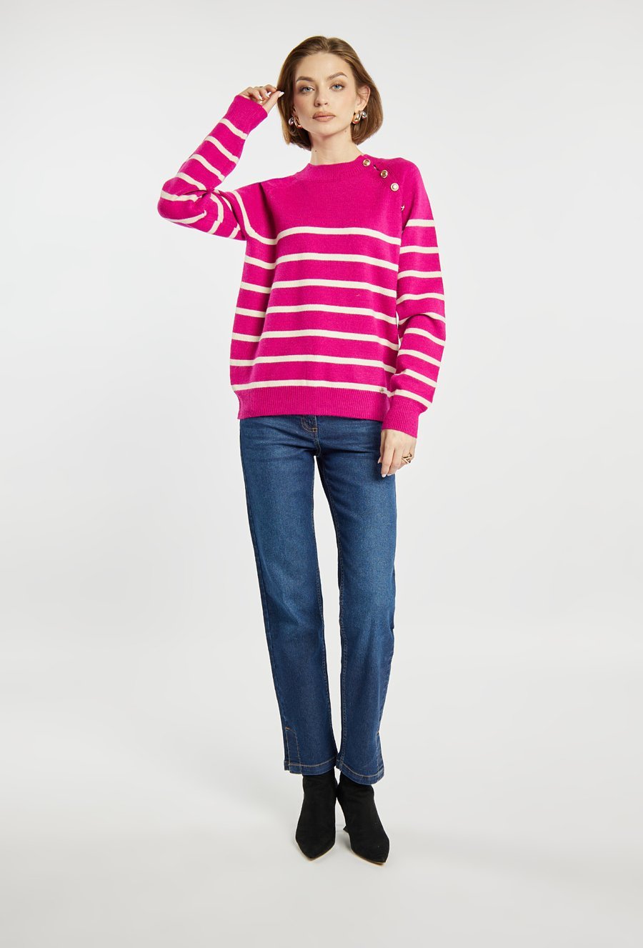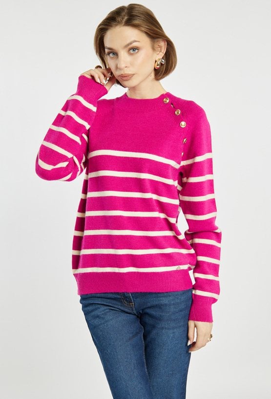 Damski sweter w paski o klasycznym kroju z okrągłym dekoltem i ozdobnymi guzikami na ramieniu. Sweter z guzikami i modnym wzorem w pasy świetnie komponuje się zarówno z jeansami, jak i eleganckimi spodniami czy spódnicą. Modelka na zdjęciu ma 177 cm wzrostu i prezentuje rozmiar S/M.