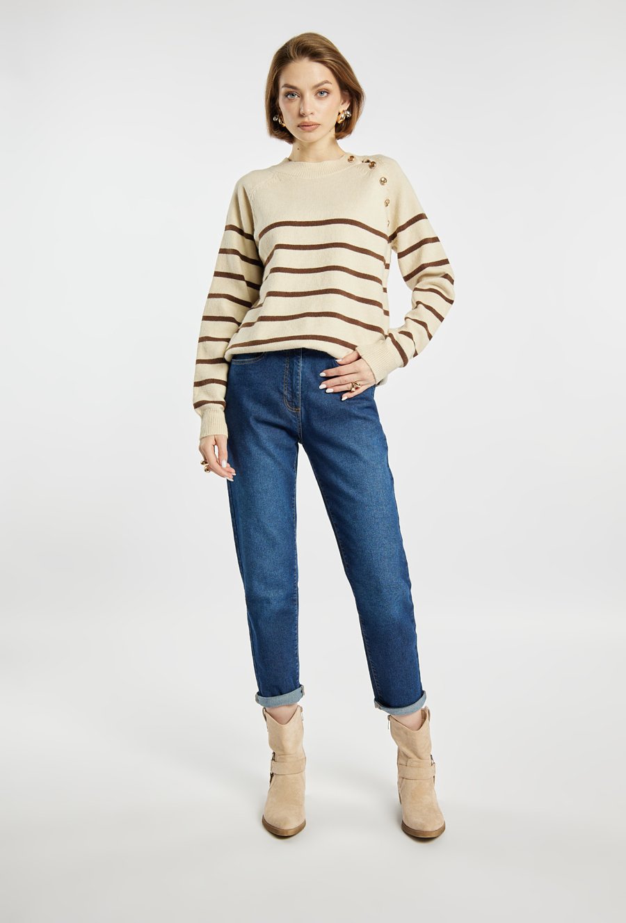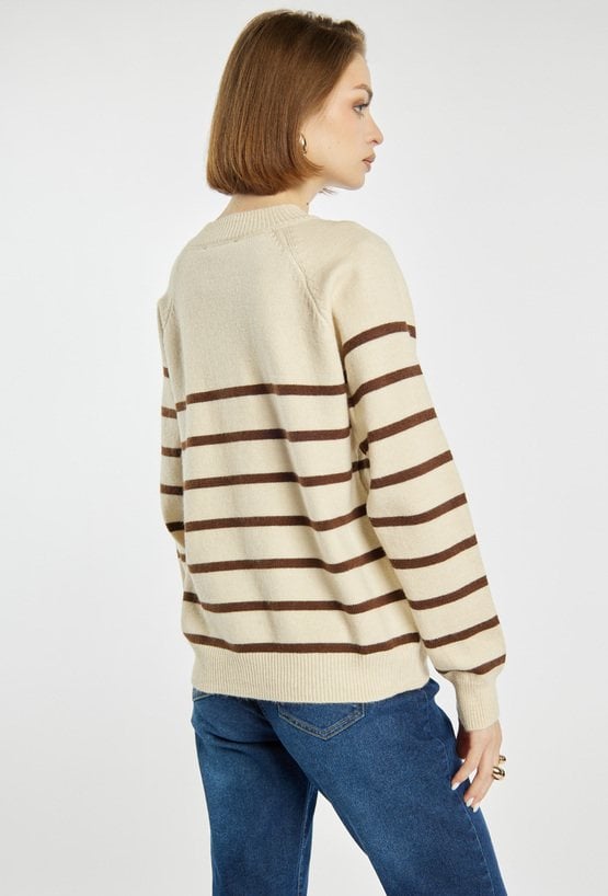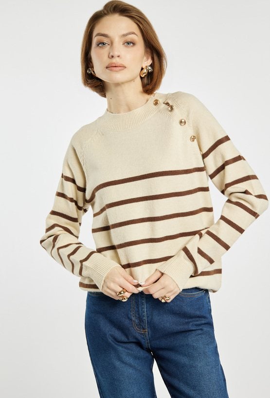 Damski sweter w paski o klasycznym kroju z okrągłym dekoltem i ozdobnymi guzikami na ramieniu. Sweter z guzikami i modnym wzorem w pasy świetnie komponuje się zarówno z jeansami, jak i eleganckimi spodniami czy spódnicą. Modelka na zdjęciu ma 177 cm wzrostu i prezentuje rozmiar S/M.