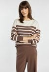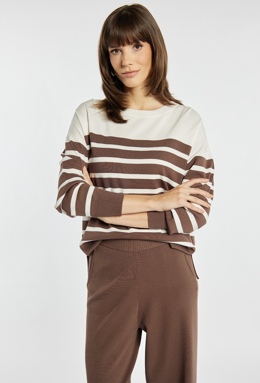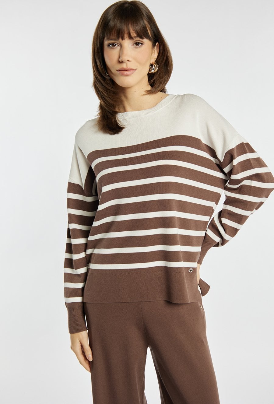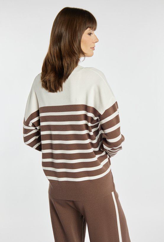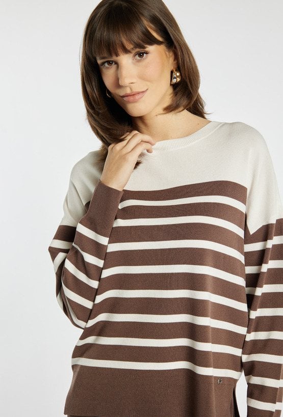 Sweter w paski o klasycznym kroju to wygodna propozycja na co dzień. Sweter z długimi rękawami i półokrągłym dekoltem zapewnia komfort noszenia, a uniwersalny wzór w pasy świetnie urozmaica codzienne stylizacje. Modelka na zdjęciu ma 177 cm wzrostu i prezentuje rozmiar S.