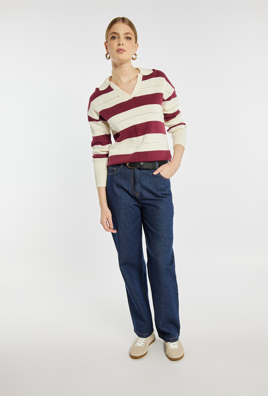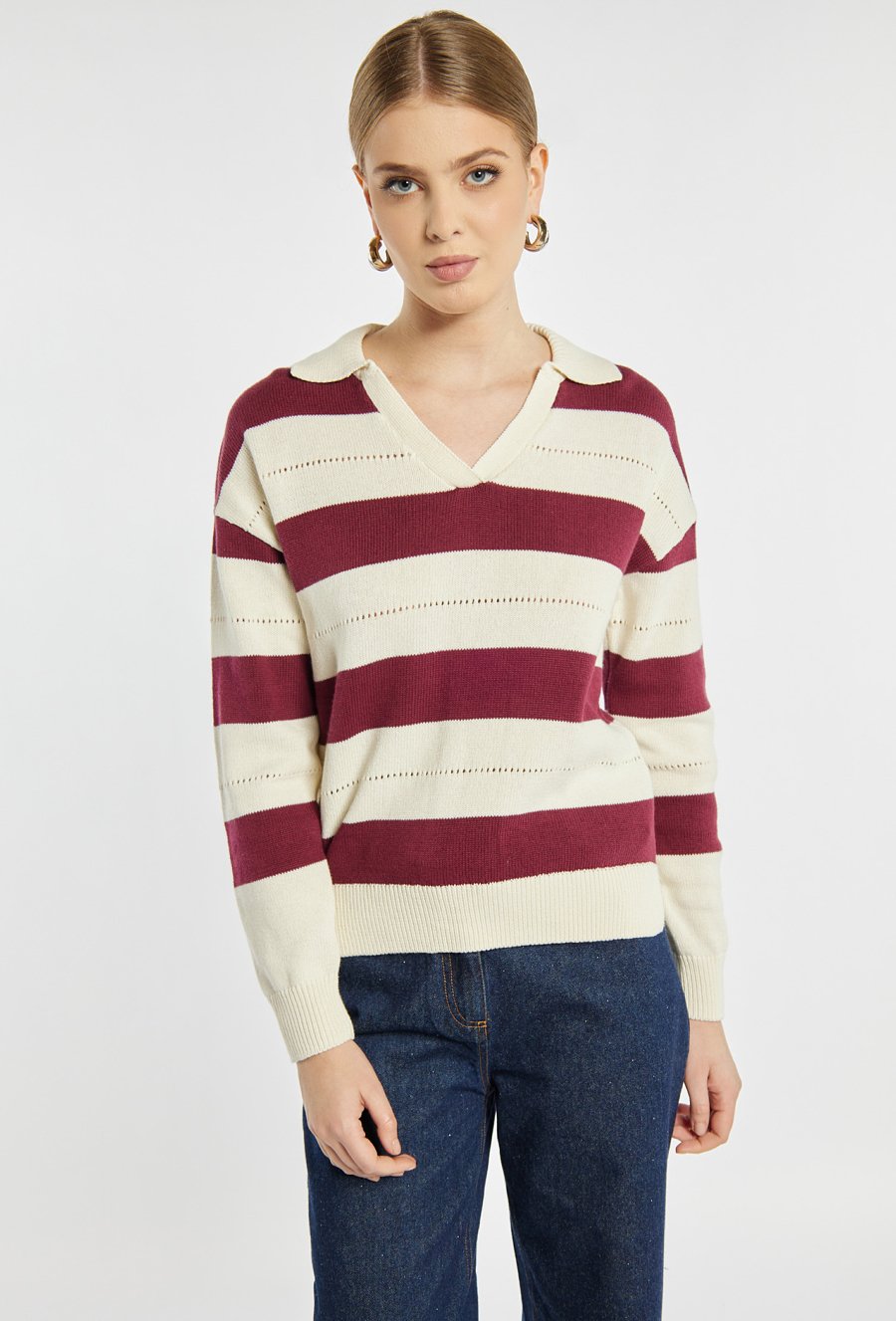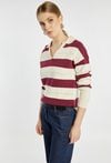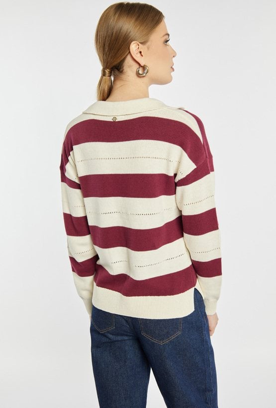 Sweter z długim rękawem i kołnierzykiem wyróżnia się szerokimi, kontrastowymi pasami oraz ażurowymi detalami między nimi, co nadaje mu lekkości i sportowej elegancji. Model idealny do codziennych, casualowych stylizacji, świetnie prezentuje się ze spodniami i spódnicami z denimu. Modelka na zdjęciu ma 177 cm wzrostu i prezentuje rozmiar S.