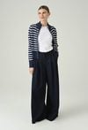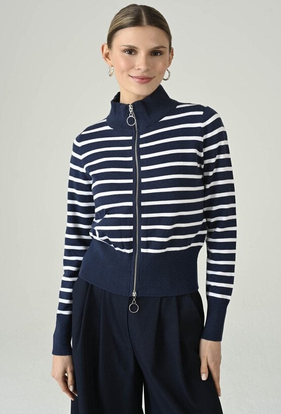 Stylowy sweter w paski wykonany z miękkiej dzianiny z dodatkiem wiskozy, który łączy komfort z modnym designem. Długi rękaw i stójka pod szyję zapewniają ciepło i wygodę, a zapinanie na dwustronny zamek daje możliwość dowolnego dopasowania stylu. Idealny do codziennych i casualowych zestawów, nadając im nowoczesnego charakteru.