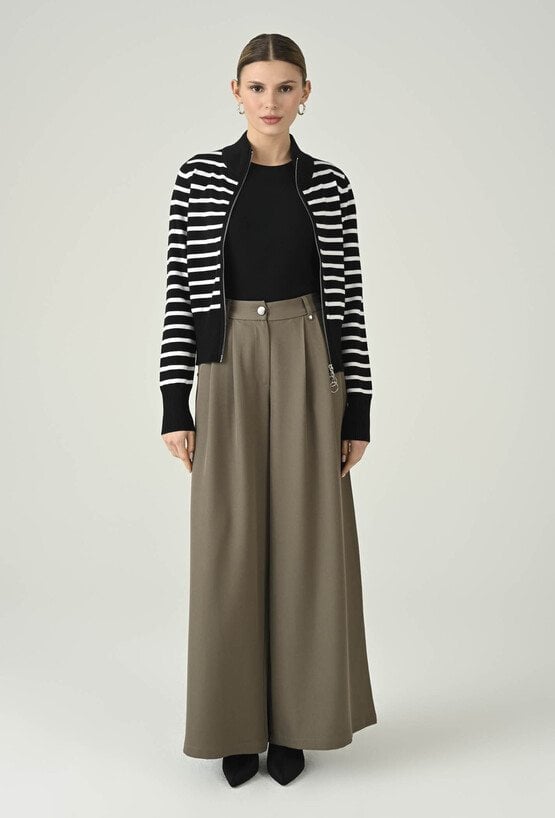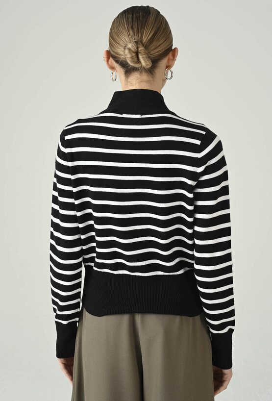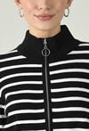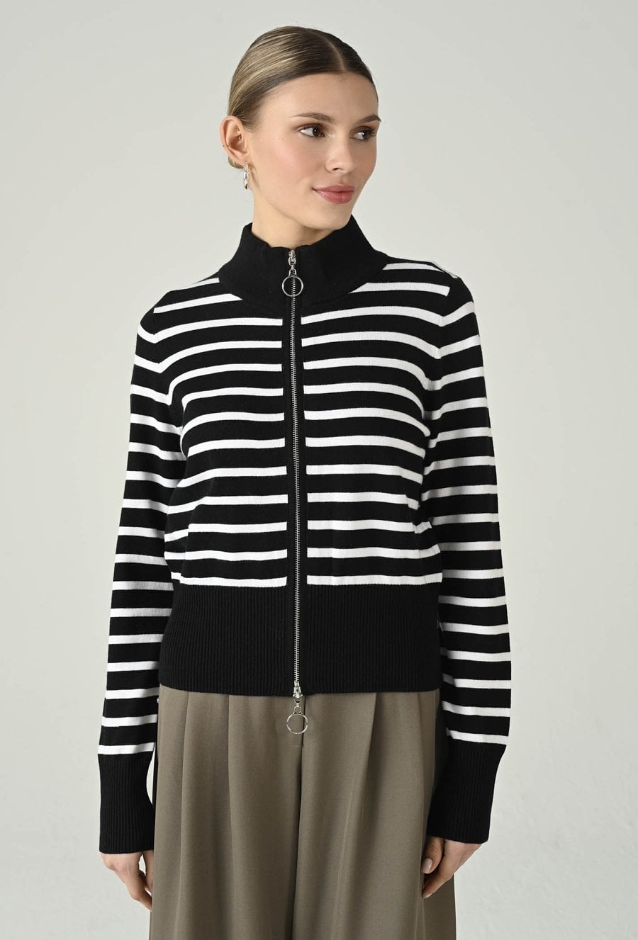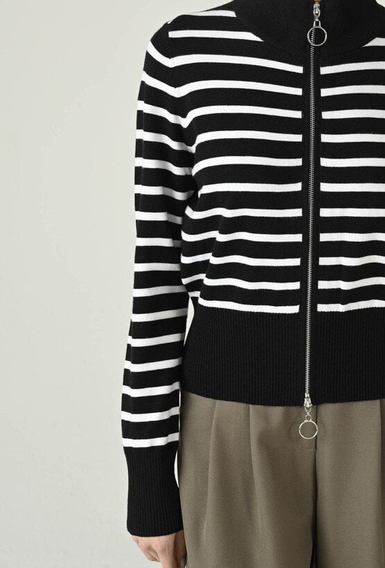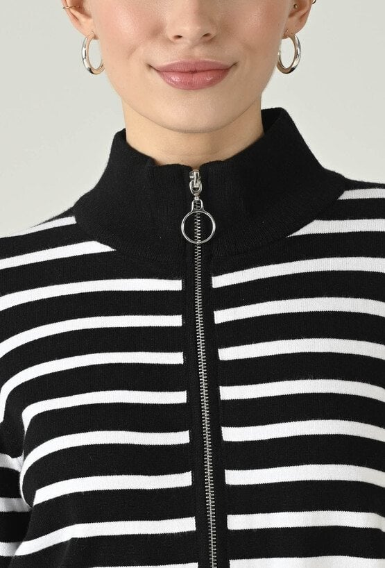Stylowy sweter w paski wykonany z miękkiej dzianiny z dodatkiem wiskozy, który łączy komfort z modnym designem. Długi rękaw i stójka pod szyję zapewniają ciepło i wygodę, a zapinanie na dwustronny zamek daje możliwość dowolnego dopasowania stylu. Idealny do codziennych i casualowych zestawów, nadając im nowoczesnego charakteru.