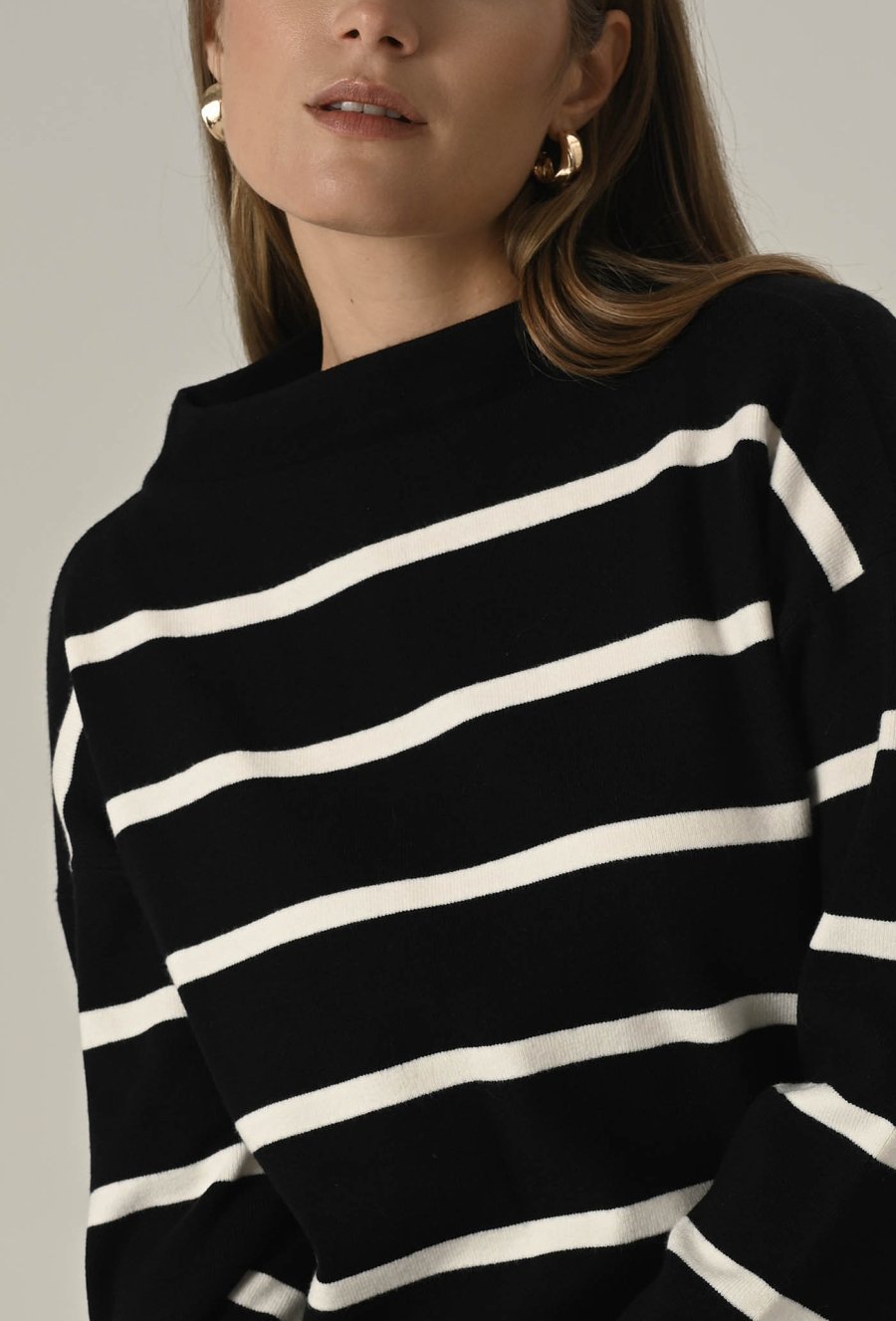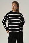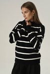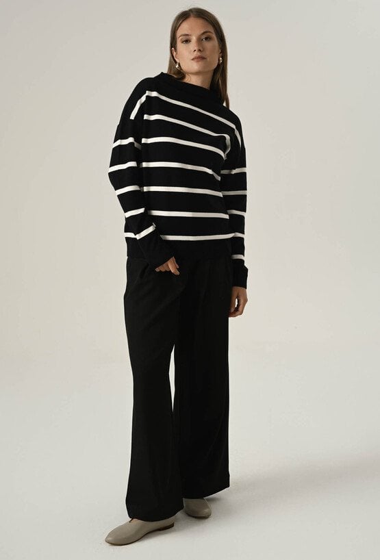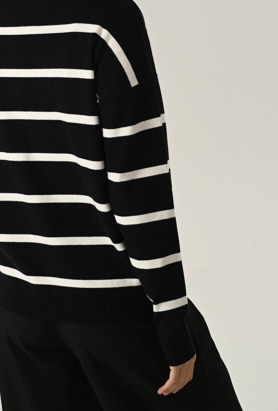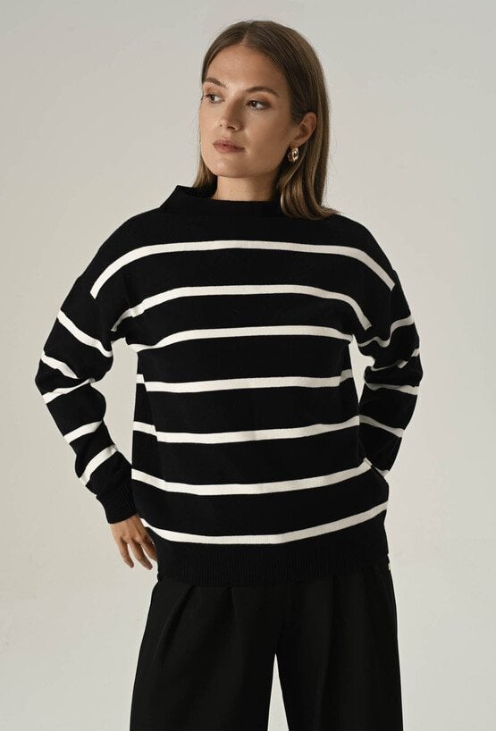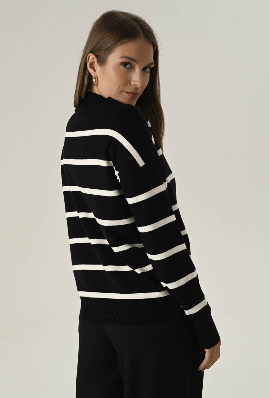 Stylowy sweter damski wykonany z miękkiej, przyjemnej w dotyku przędzy. Klasyczny wzór w paski w połączeniu ze stójką nadaje całości eleganckiego, a zarazem nowoczesnego charakteru. Fason świetnie układa się na sylwetce i sprawdzi się zarówno w codziennych, jak i bardziej formalnych stylizacjach. Modelka na zdjęciu ma 177 cm wzrostu i prezentuje rozmiar 36/S.
