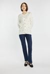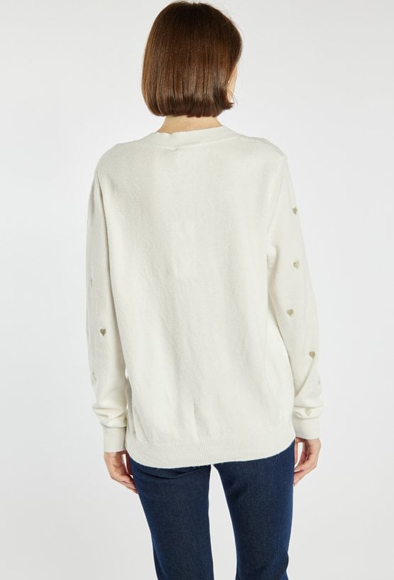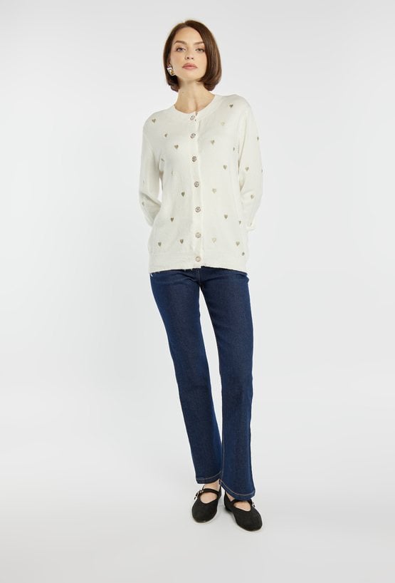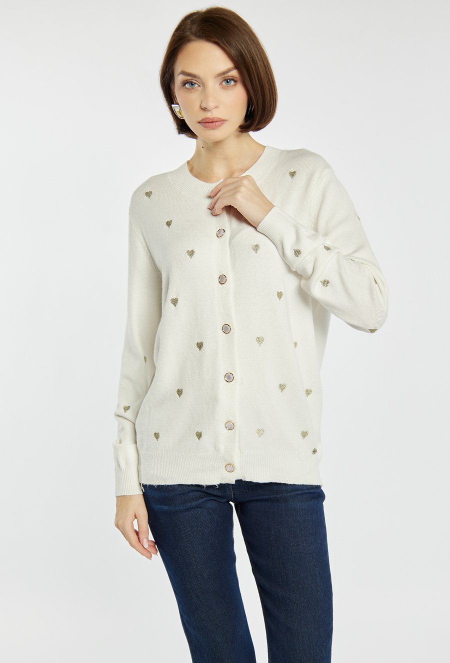 Sweter zapinany na guziki, ozdobiony drobnym wzorem w serduszka, który dodaje mu uroku i subtelności. Miękki, przyjemny w dotyku materiał gwarantuje wygodę noszenia, a klasyczny krój sprawia, że pasuje do wielu stylizacji – zarówno codziennych, jak i bardziej eleganckich. Modelka na zdjęciu ma 177 cm wzrostu i prezentuje rozmiar S/M.