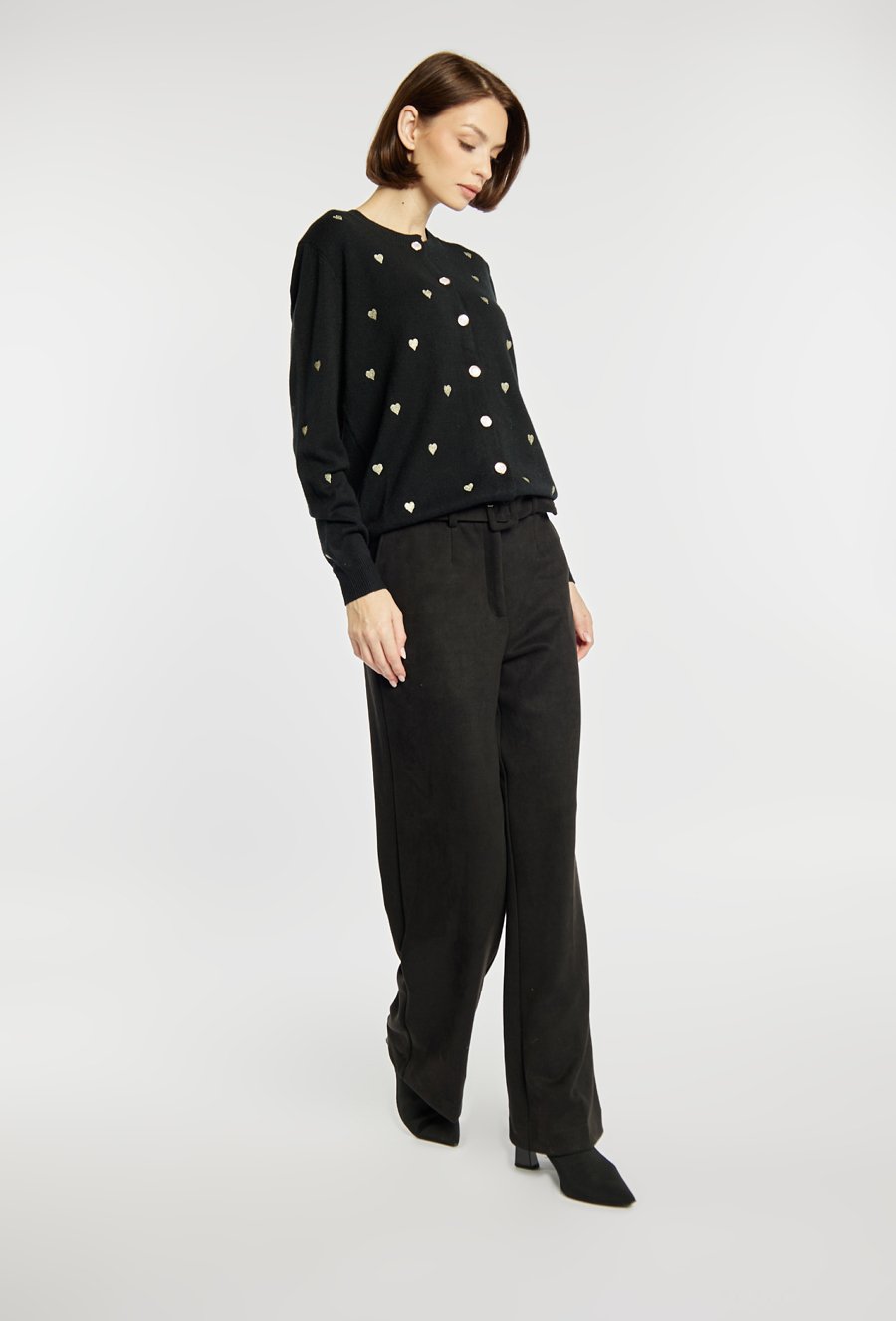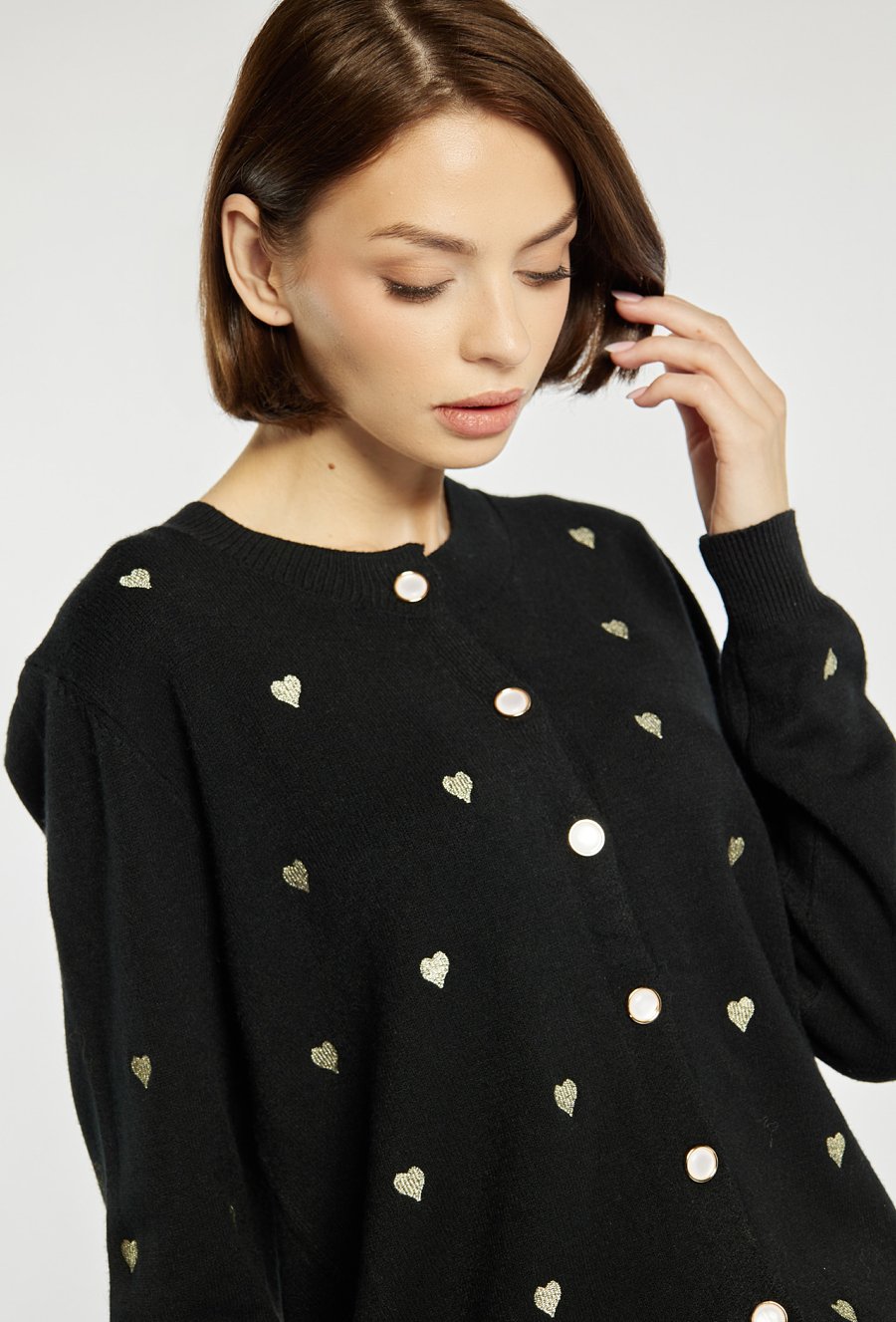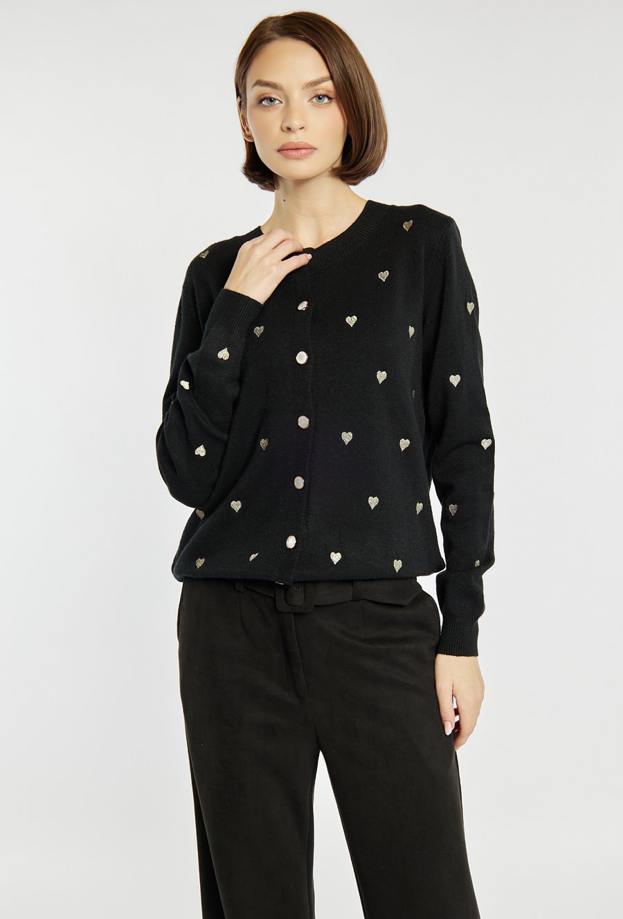 Sweter zapinany na guziki, ozdobiony drobnym wzorem w serduszka, który dodaje mu uroku i subtelności. Miękki, przyjemny w dotyku materiał gwarantuje wygodę noszenia, a klasyczny krój sprawia, że pasuje do wielu stylizacji – zarówno codziennych, jak i bardziej eleganckich. Modelka na zdjęciu ma 177 cm wzrostu i prezentuje rozmiar S/M.