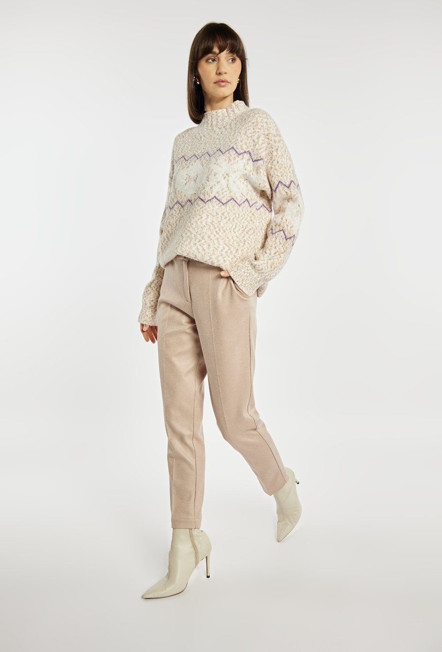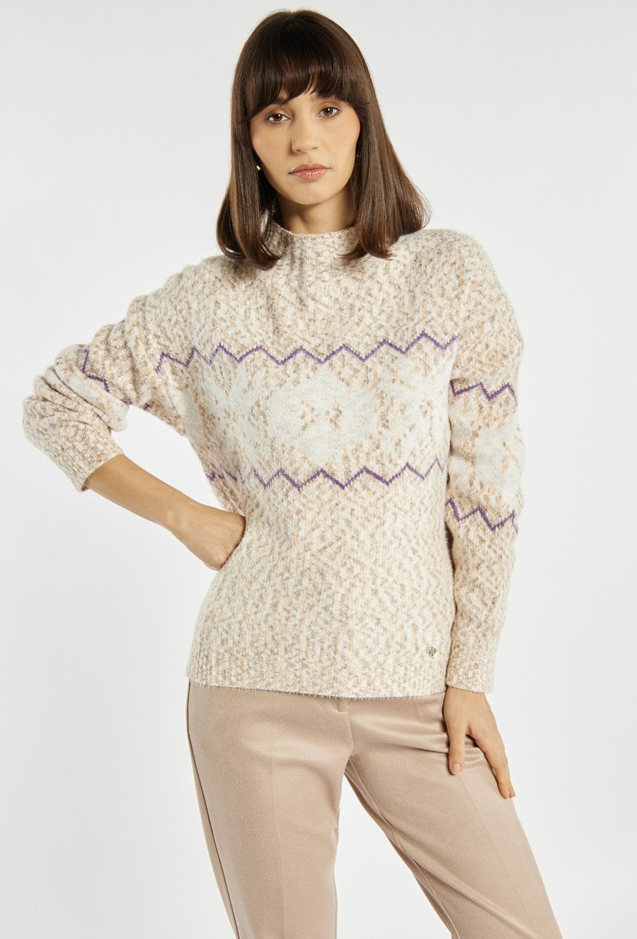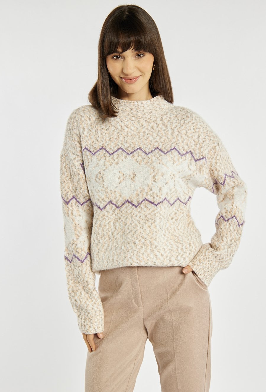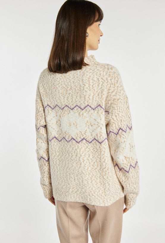 Sweter damski wykonany z przyjemnego w dotyku materiału. Sweter z długimi rękawami i półgolfem wyróżnia się świątecznym charakterem dzięki dekoracyjnemu wzorowi. Model dostępny jest w kilku wariantach kolorystycznych, co ułatwia dopasowanie go do indywidualnego stylu. Modelka na zdjęciu ma 177 cm wzrostu i prezentuje rozmiar S/M.