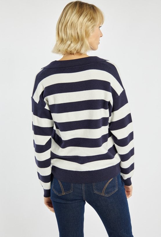 Sweter w szerokie pasy o luźnym, komfortowym kroju. Model z kołnierzykiem i dekoltem w serek. Doskonały wybór do codziennych, casualowych stylizacji z nutą nowoczesnej elegancji. Modelka na zdjęciu ma 177 cm wzrostu i prezentuje rozmiar S/M.