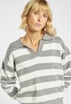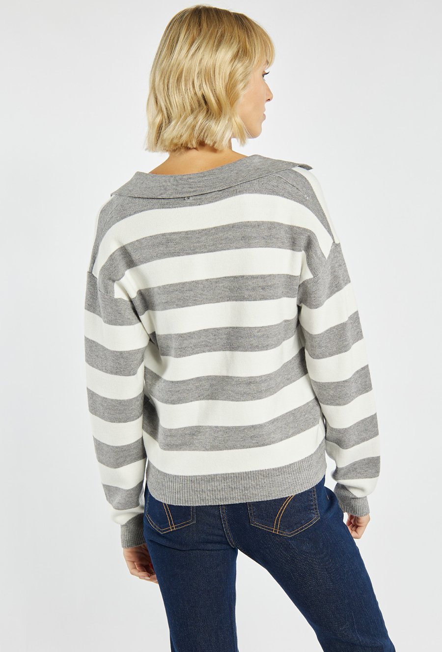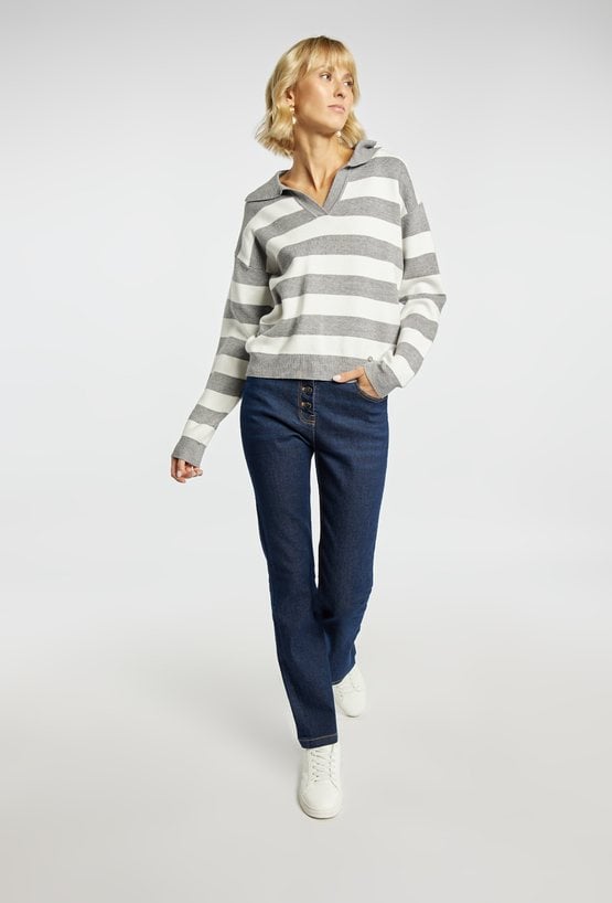 Sweter w szerokie pasy o luźnym, komfortowym kroju. Model z kołnierzykiem i dekoltem w serek. Doskonały wybór do codziennych, casualowych stylizacji z nutą nowoczesnej elegancji. Modelka na zdjęciu ma 177 cm wzrostu i prezentuje rozmiar S/M.