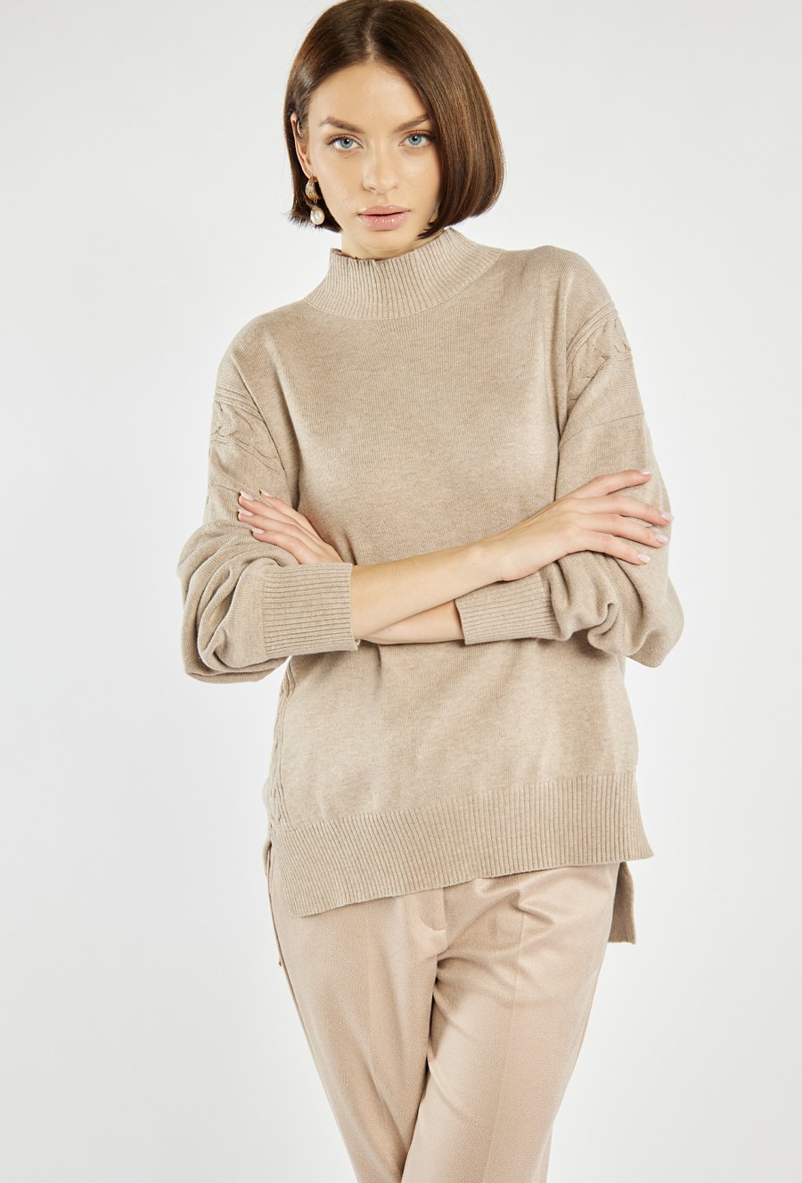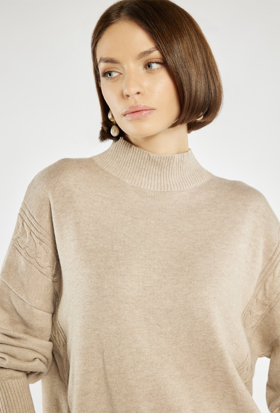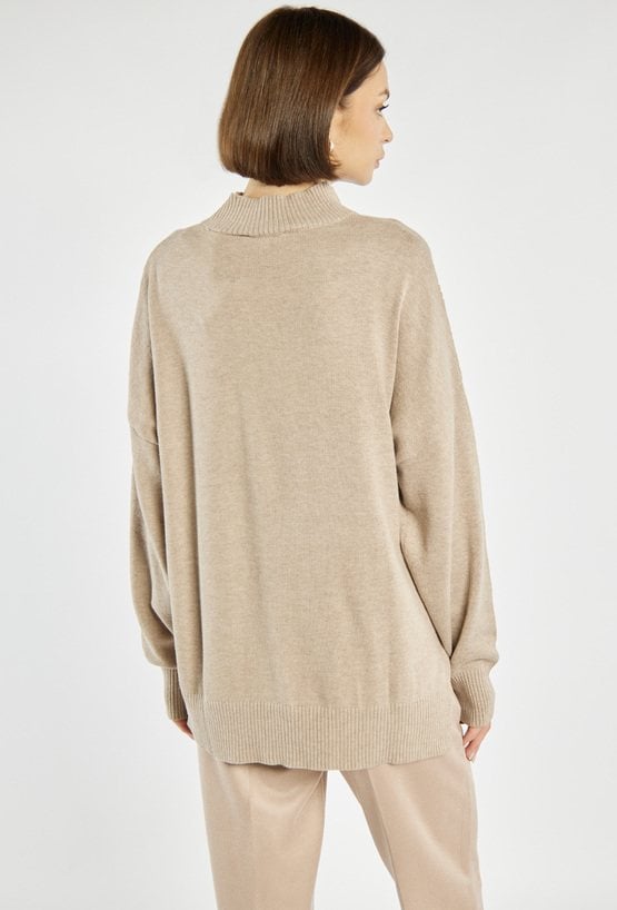 Sweter damski o luźnym kroju z delikatnie podwyższonym golfem. Subtelny splot i klasyczny fason sprawiają, że model ten doskonale sprawdzi się w codziennych, jesienno-zimowych stylizacjach. Modelka na zdjęciu ma 177 cm wzrostu i prezentuje rozmiar S.