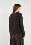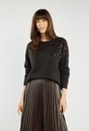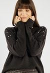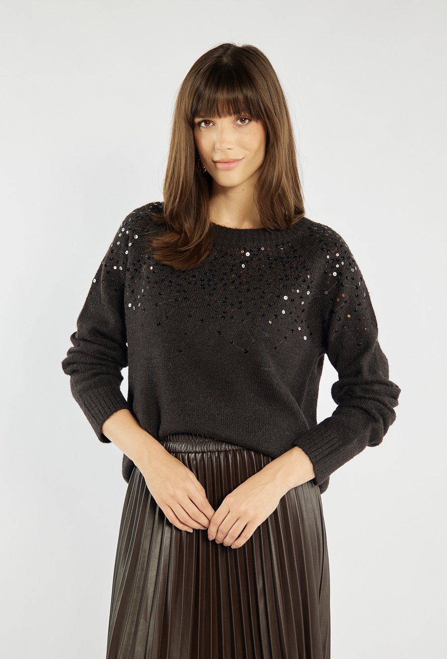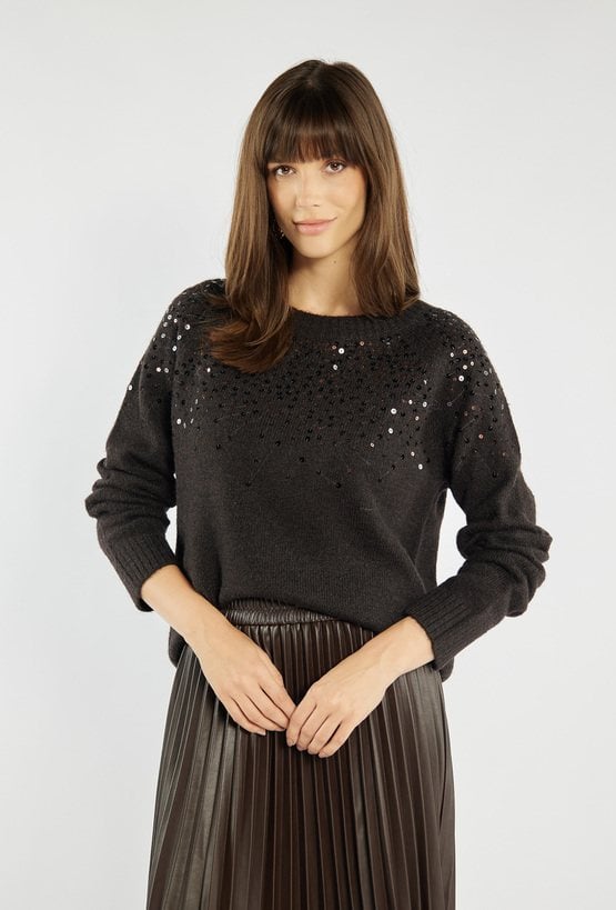 Sweter damski o subtelnym, kobiecym charakterze. Góra ozdobiona błyszczącymi cekinami, które dodają całości elegancji i świątecznego blasku. Sweter z klasycznym, okrągłym dekoltem i długimi rękawami. Idealny wybór na zimowe dni oraz stylizacje w okresie świątecznym. Modelka na zdjęciu ma 177 cm wzrostu i prezentuje rozmiar S.