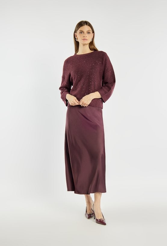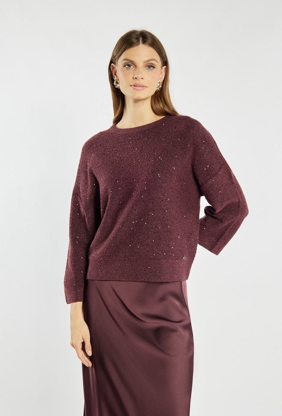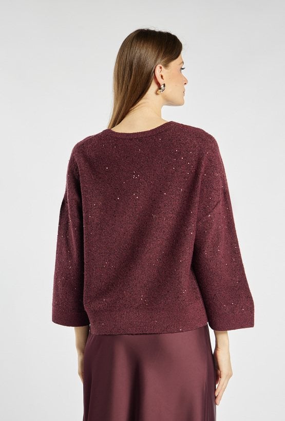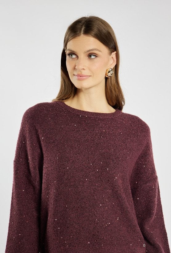 Sweter o prostym kroju, z rękawem 3/4. Subtelnie ozdobiony drobnymi cekinami, które dodają mu elegancji i sprawiają, że świetnie sprawdzi się nie tylko na co dzień, ale też na wyjątkowe okazje, takie jak święta czy spotkania w gronie rodziny i przyjaciół. Modelka na zdjęciu ma 177 cm wzrostu i prezentuje rozmiar S.