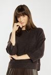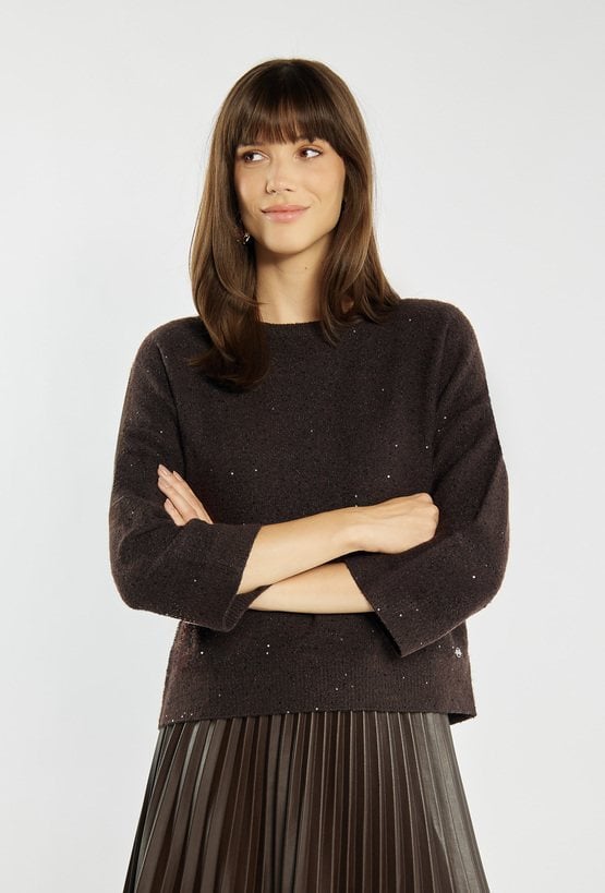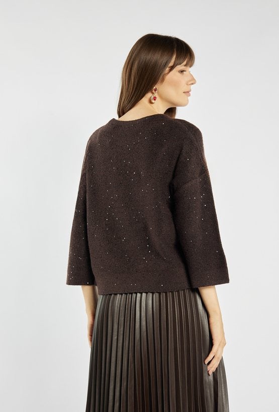 Sweter o prostym kroju, z rękawem 3/4. Subtelnie ozdobiony drobnymi cekinami, które dodają mu elegancji i sprawiają, że świetnie sprawdzi się nie tylko na co dzień, ale też na wyjątkowe okazje, takie jak święta czy spotkania w gronie rodziny i przyjaciół. Modelka na zdjęciu ma 177 cm wzrostu i prezentuje rozmiar S.
