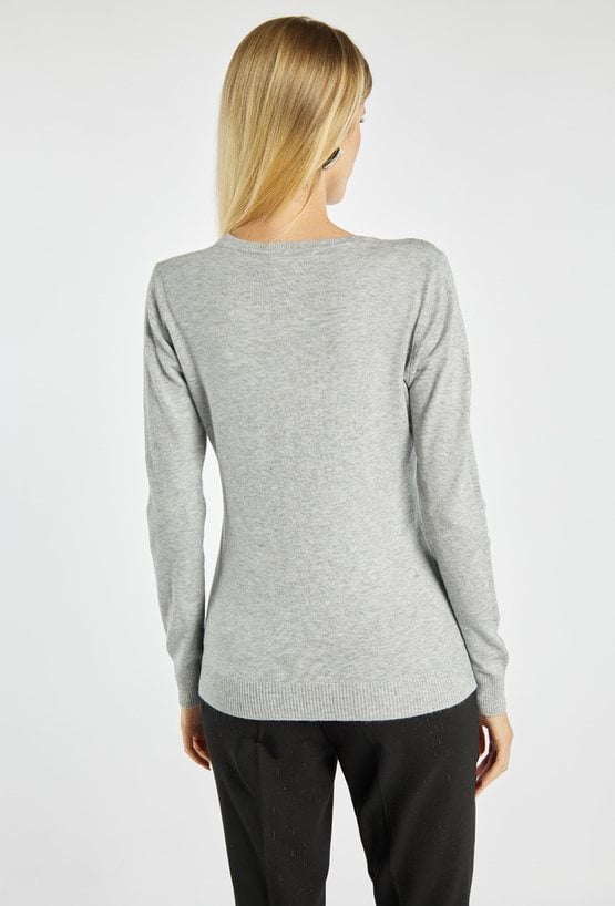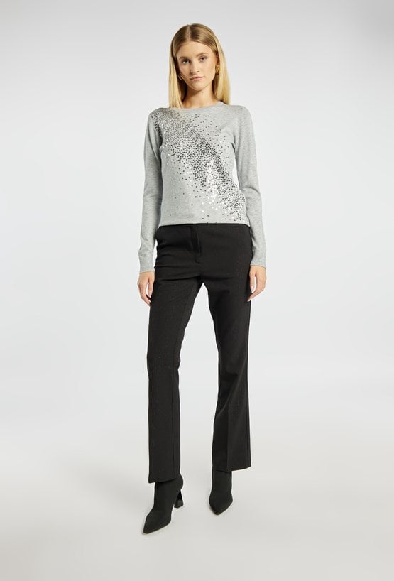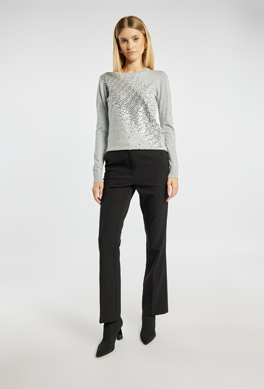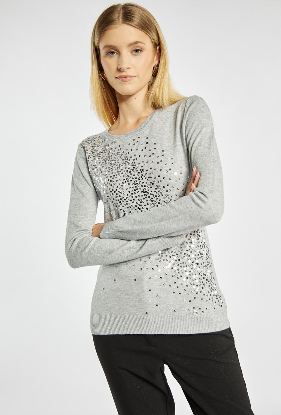 Sweter damski z ozdobnymi cekinami. Sweter z klasycznym dekoltem i długimi rękawami to idealna propozycja na wyjątkowe okazje oraz wieczorne wyjścia. Modelka na zdjęciu ma 177 cm wzrostu i prezentuje rozmiar S/M.