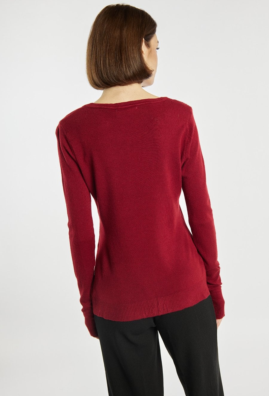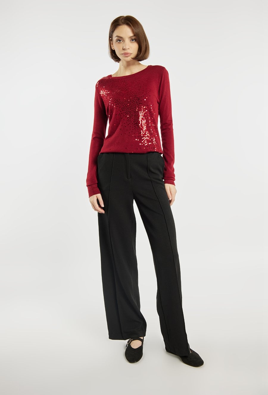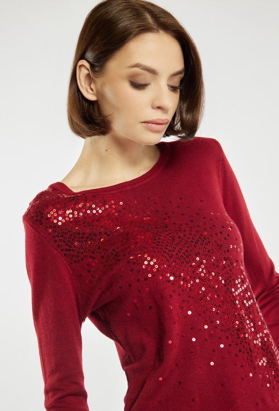 Sweter damski z ozdobnymi cekinami. Sweter z klasycznym dekoltem i długimi rękawami to idealna propozycja na wyjątkowe okazje oraz wieczorne wyjścia. Modelka na zdjęciu ma 177 cm wzrostu i prezentuje rozmiar S/M.