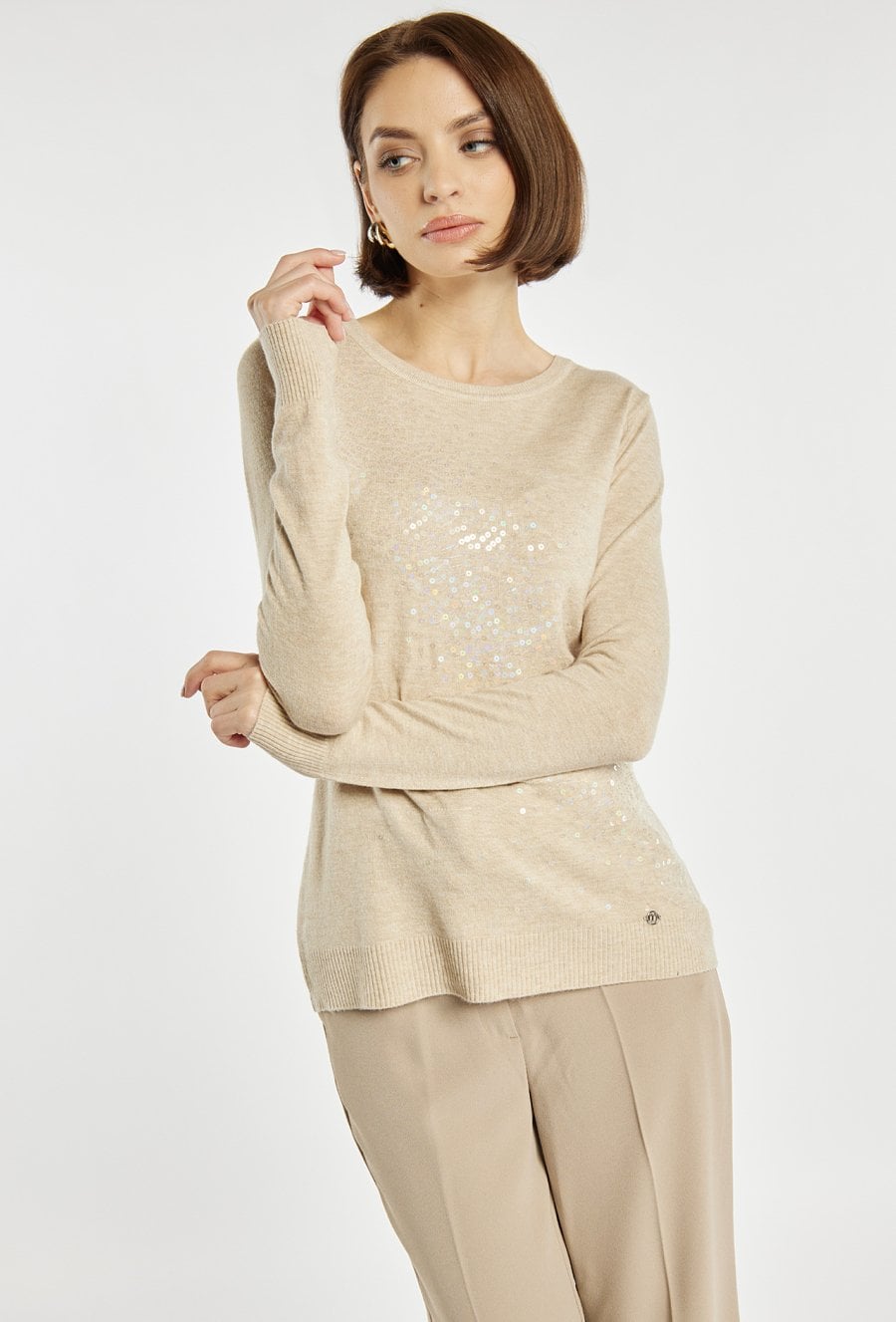 Sweter damski z ozdobnymi cekinami. Sweter z klasycznym dekoltem i długimi rękawami to idealna propozycja na wyjątkowe okazje oraz wieczorne wyjścia. Modelka na zdjęciu ma 177 cm wzrostu i prezentuje rozmiar S/M.