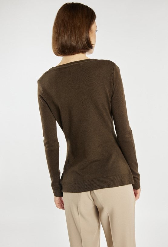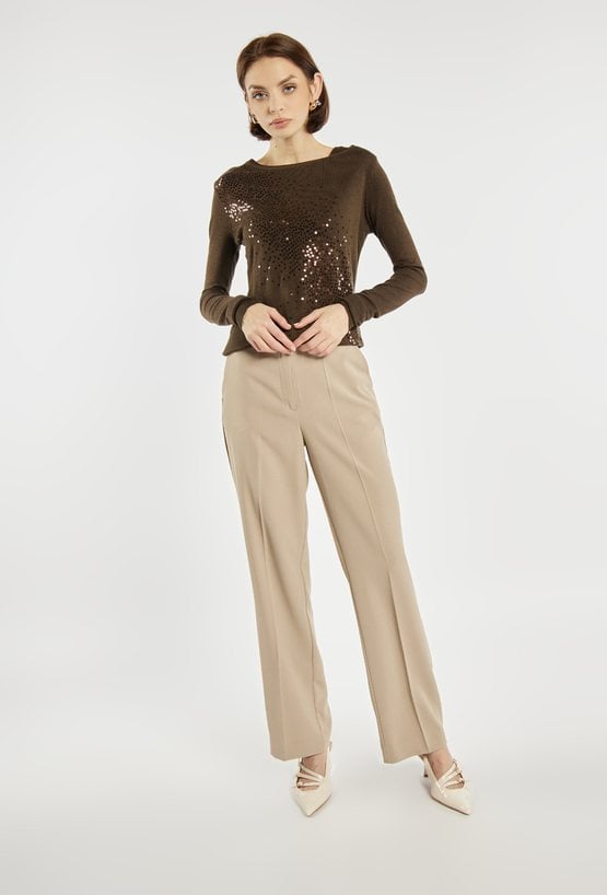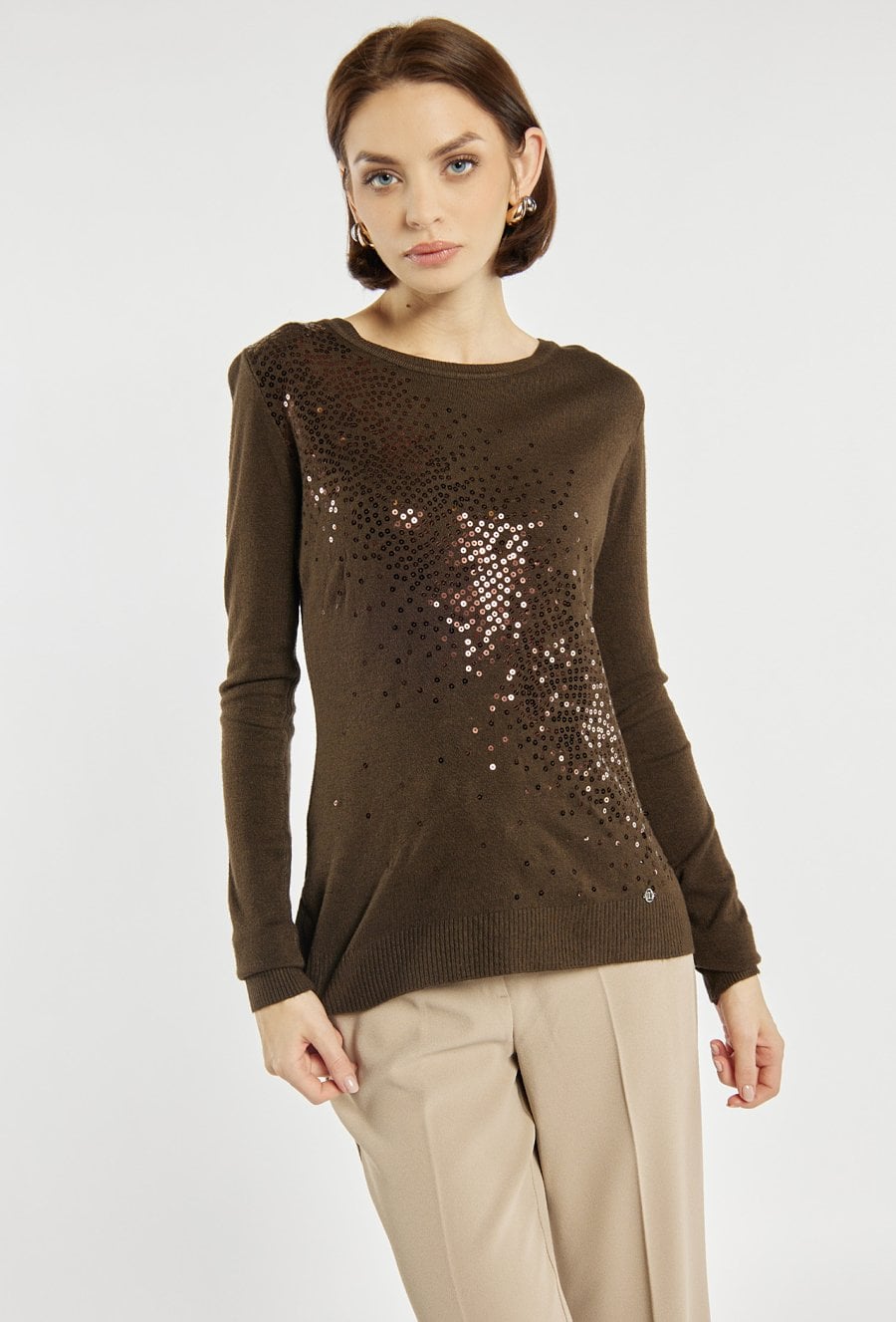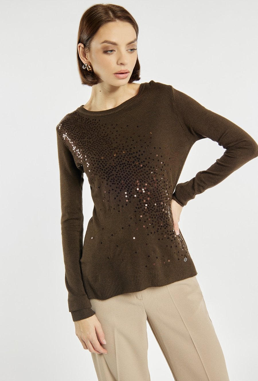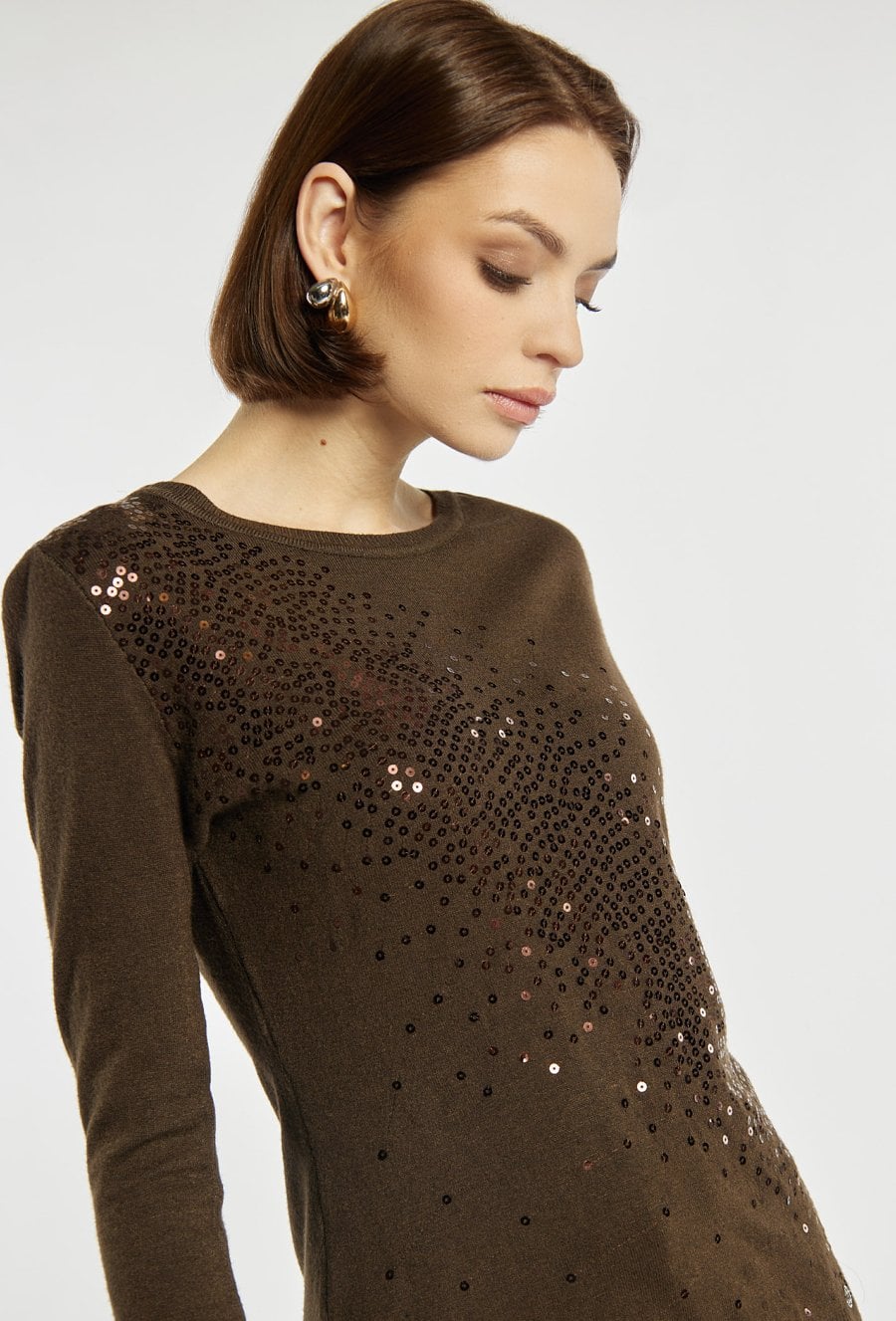 Sweter damski z ozdobnymi cekinami. Sweter z klasycznym dekoltem i długimi rękawami to idealna propozycja na wyjątkowe okazje oraz wieczorne wyjścia. Modelka na zdjęciu ma 177 cm wzrostu i prezentuje rozmiar S/M.