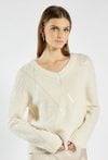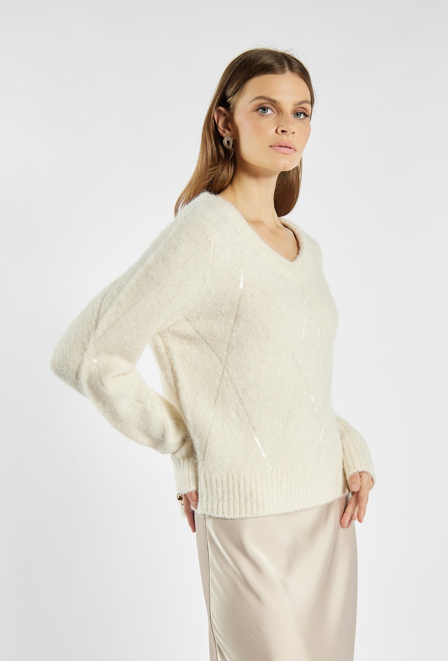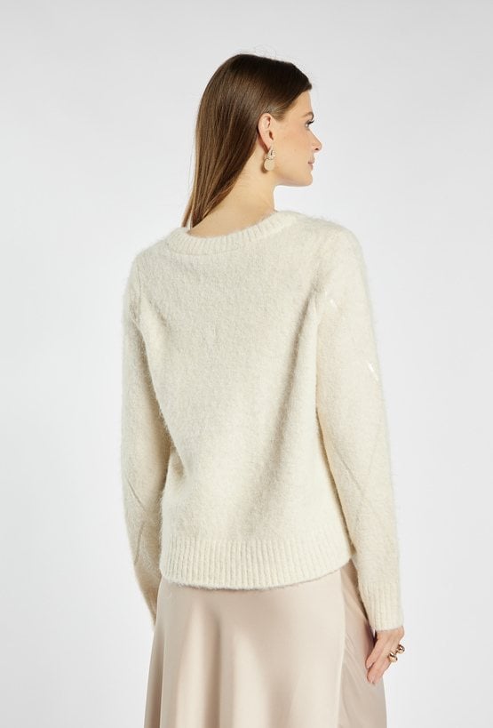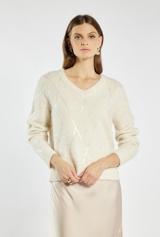 Sweter damski z delikatnym połyskiem, który subtelnie odbija światło. Sweter z klasycznym dekoltem w serek, wykonany z miękkiego, przyjemnego w dotyku materiału. Model ten sprawdzi się zarówno podczas świątecznych spotkań, jak i codziennych stylizacji o bardziej szykownym charakterze. Modelka na zdjęciu ma 177 cm wzrostu i prezentuje rozmiar S.