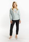 Sweter damski z przyjemnego w dotyku materiału. Sweter z półokrągłym dekoltem, długimi rękawami oraz dżetowym motylem. Sweter idealnie sprawdzi się w codziennych stylizacjach. Modelka ma 177 cm i prezentuje rozmiar S.
