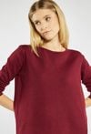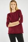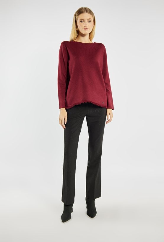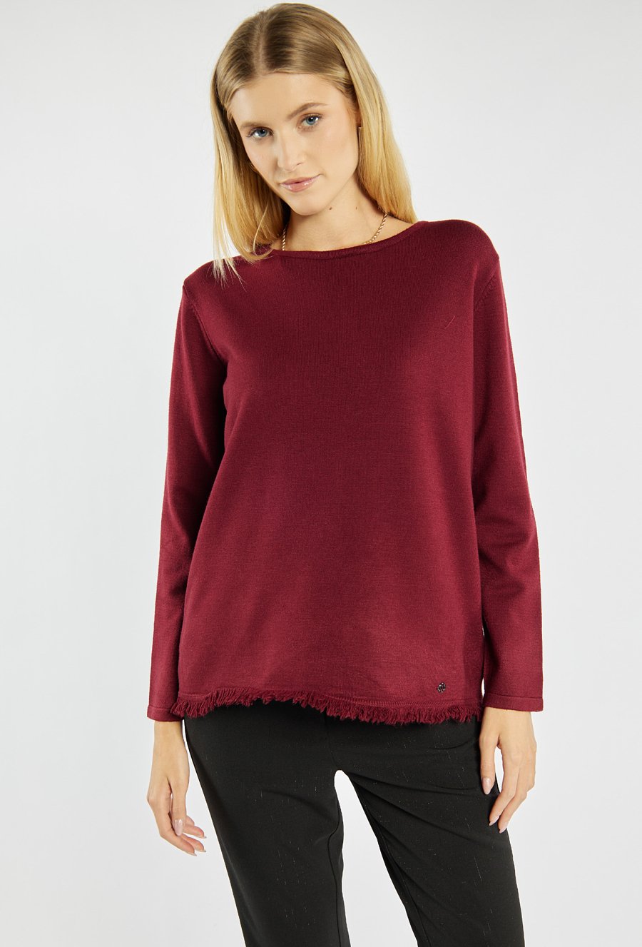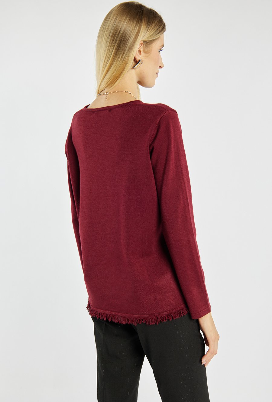 Sweter damski o prostym kroju, wykończony delikatnymi frędzlami u dołu. Klasyczny model, który świetnie sprawdzi się zarówno w casualowych, jak i bardziej eleganckich stylizacjach. Modelka na zdjęciu ma 177 cm wzrostu i prezentuje rozmiar S/M.