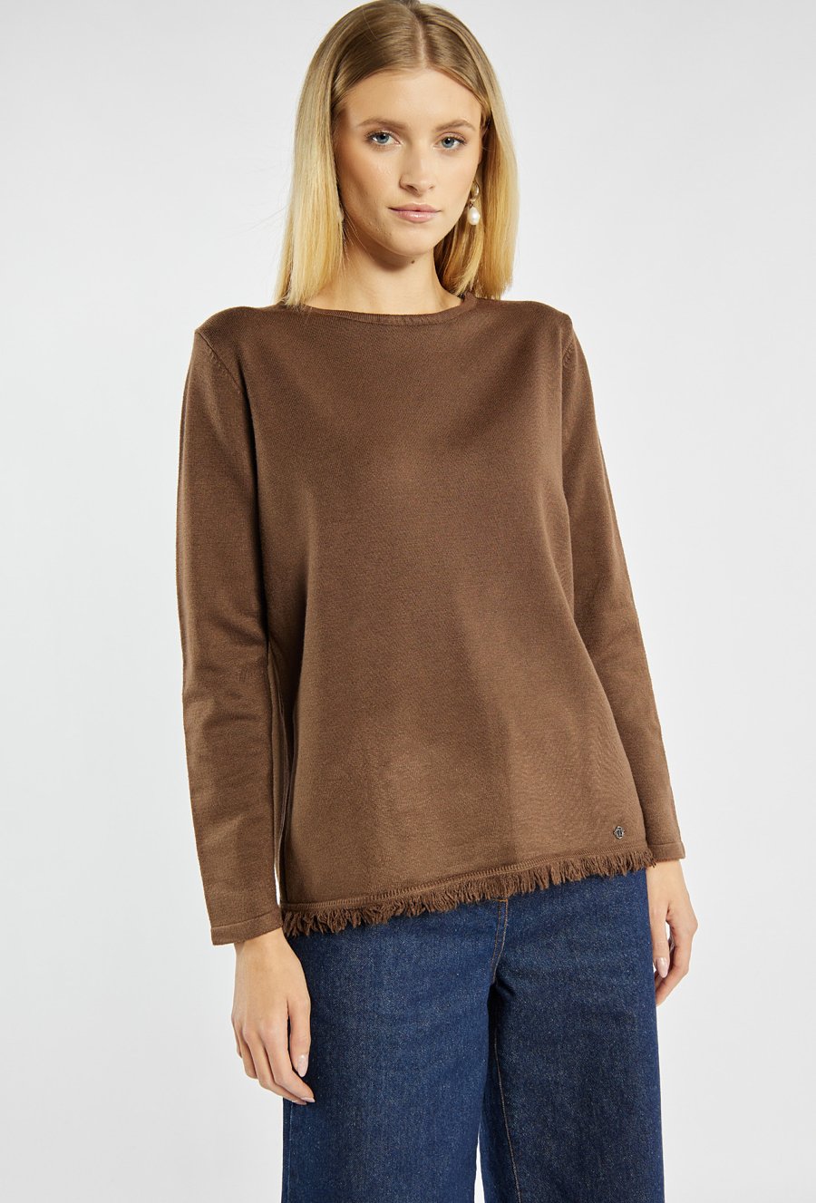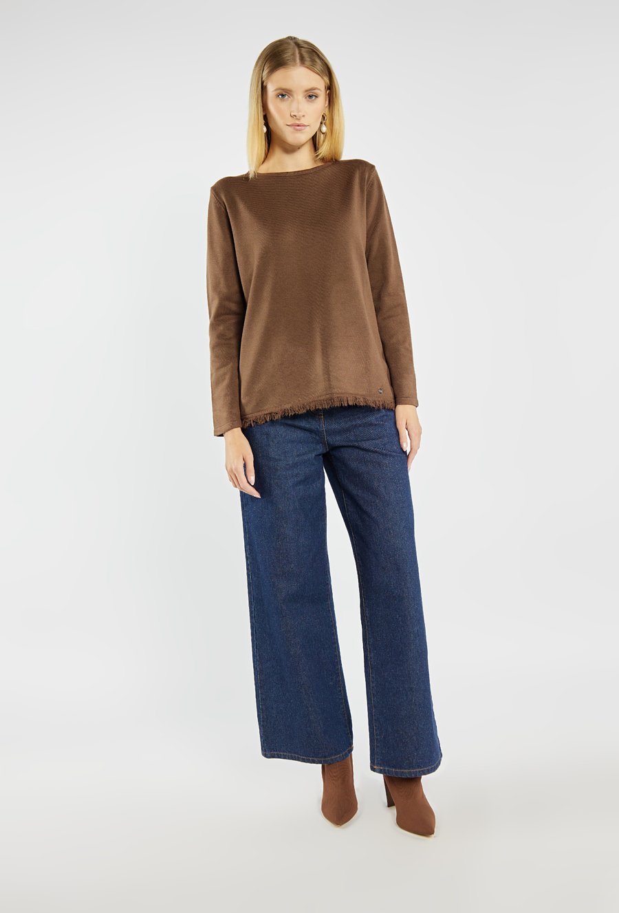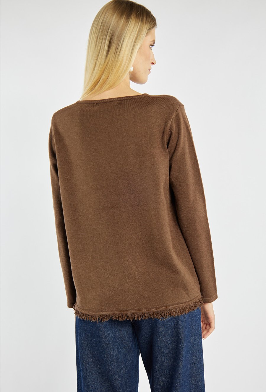 Sweter damski o prostym kroju, wykończony delikatnymi frędzlami u dołu. Klasyczny model, który świetnie sprawdzi się zarówno w casualowych, jak i bardziej eleganckich stylizacjach. Modelka na zdjęciu ma 177 cm wzrostu i prezentuje rozmiar S/M.