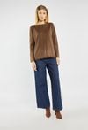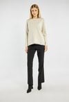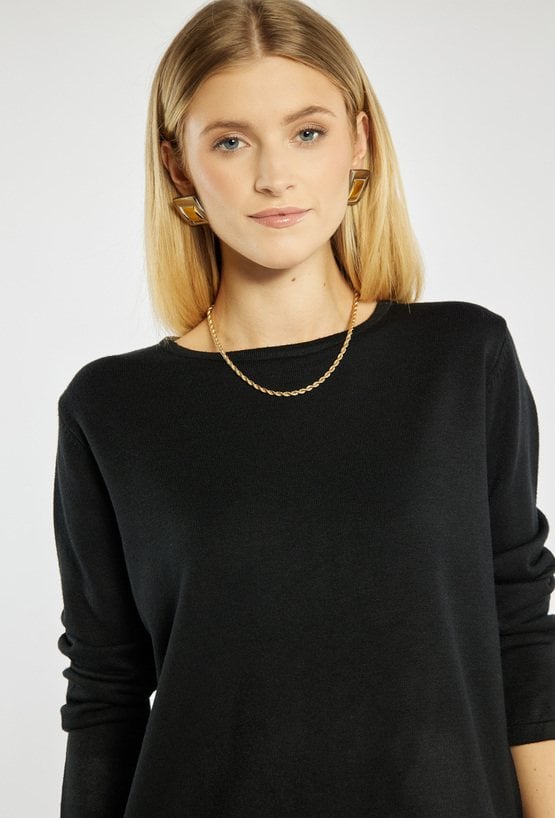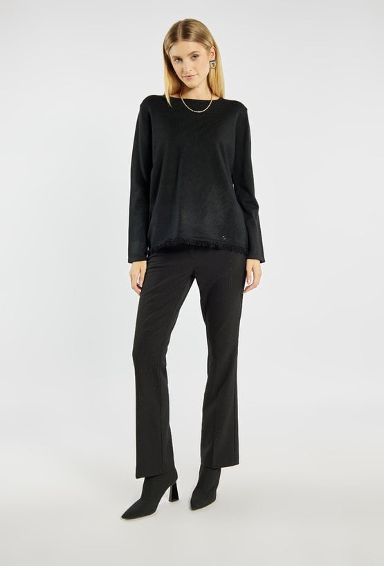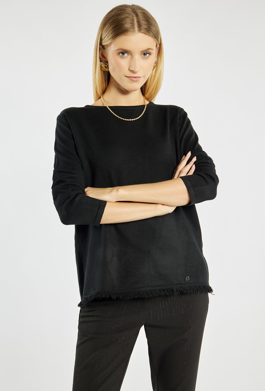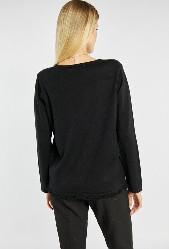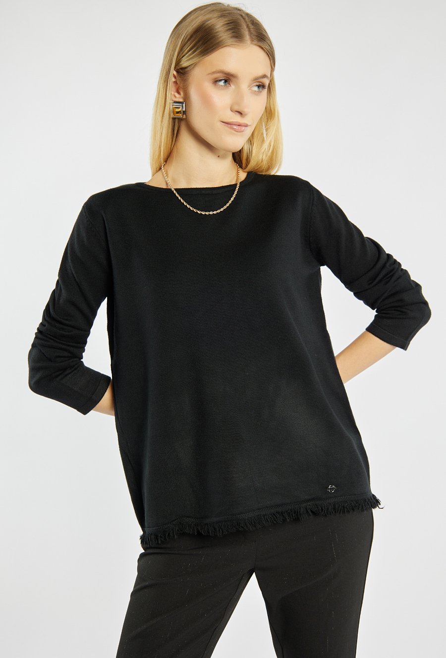 Sweter damski o prostym kroju, wykończony delikatnymi frędzlami u dołu. Klasyczny model, który świetnie sprawdzi się zarówno w casualowych, jak i bardziej eleganckich stylizacjach. Modelka na zdjęciu ma 177 cm wzrostu i prezentuje rozmiar S/M.