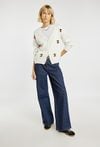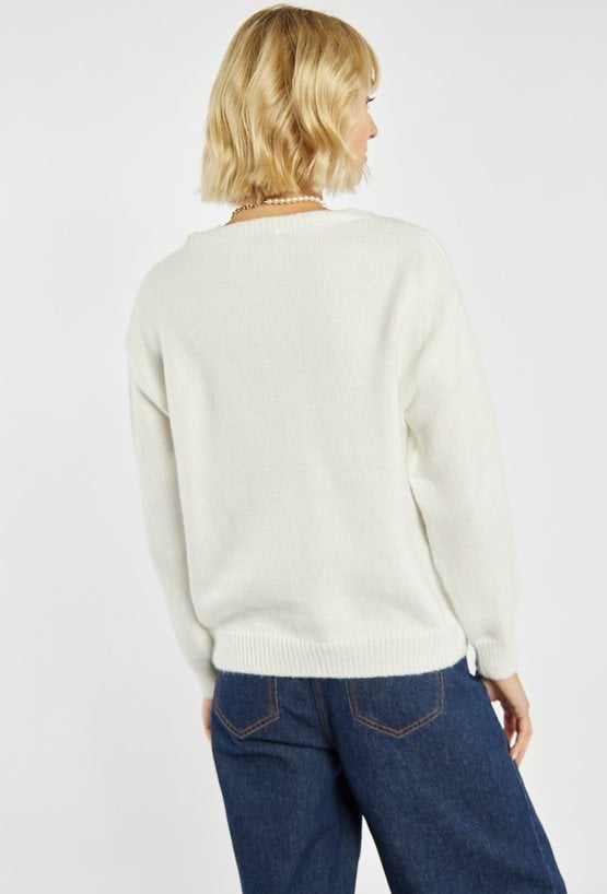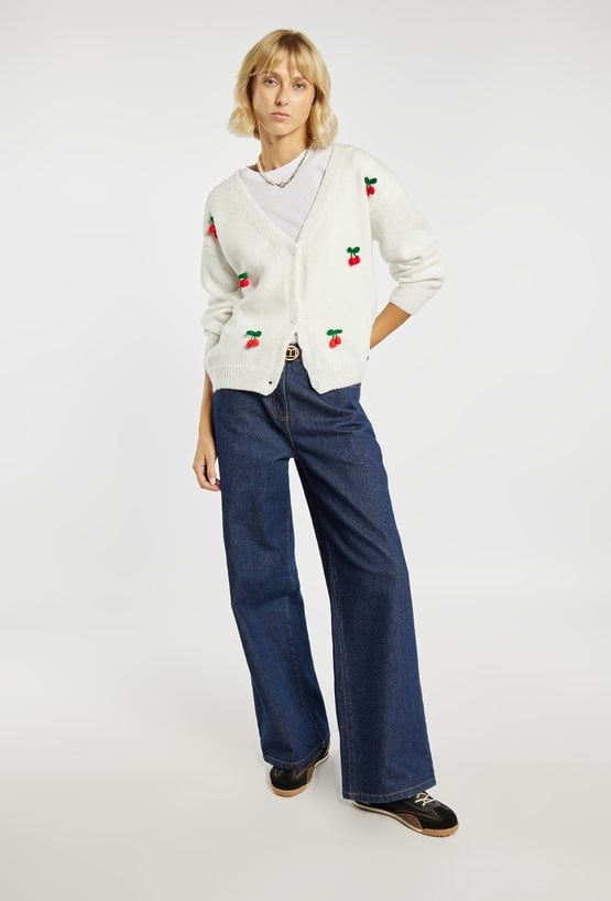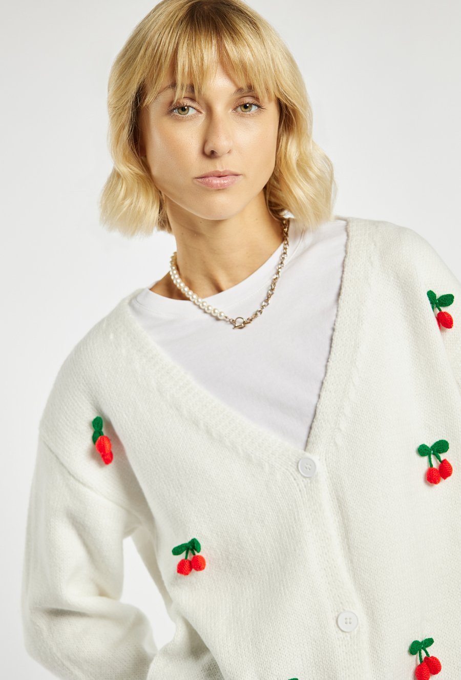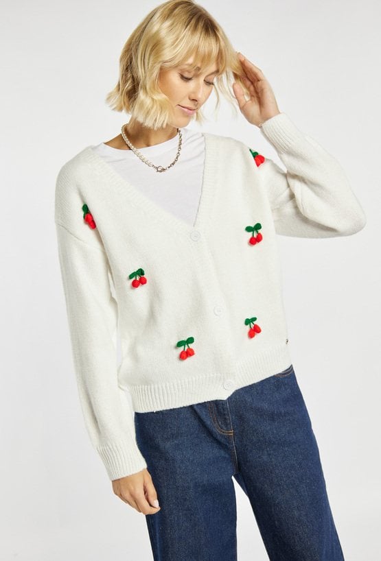 Uroczy sweter zapinany na guziki, ozdobiony haftowanym motywem wisienek. Sweter o luźnym kroju z dekoltem w serek. Idealny do casualowych stylizacji, wprowadzając odrobinę świeżości i dziewczęcego uroku. Modelka na zdjęciu ma 177 cm wzrostu i prezentuje rozmiar S/M.