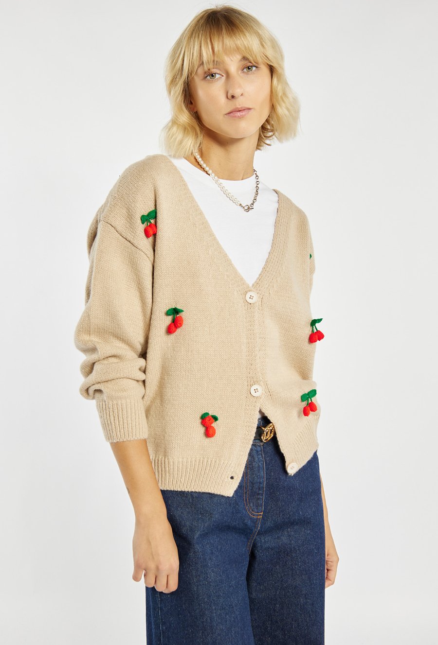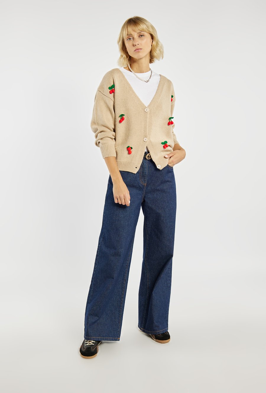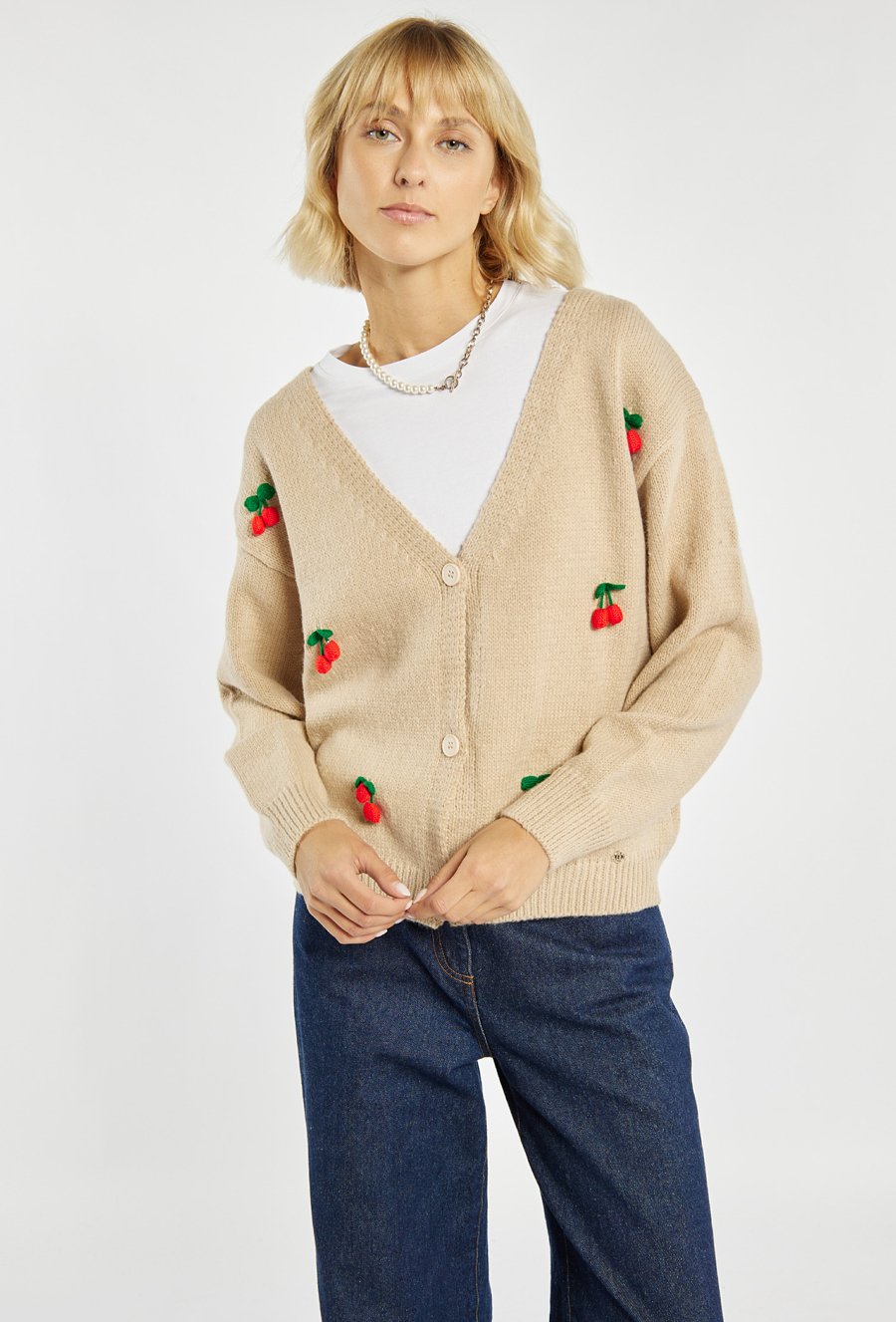 Uroczy sweter zapinany na guziki, ozdobiony haftowanym motywem wisienek. Sweter o luźnym kroju z dekoltem w serek. Idealny do casualowych stylizacji, wprowadzając odrobinę świeżości i dziewczęcego uroku. Modelka na zdjęciu ma 177 cm wzrostu i prezentuje rozmiar S/M.