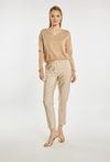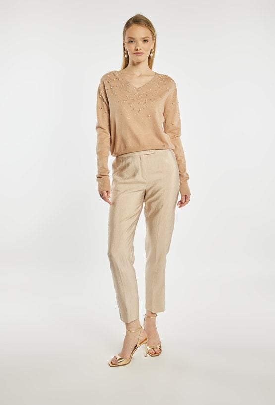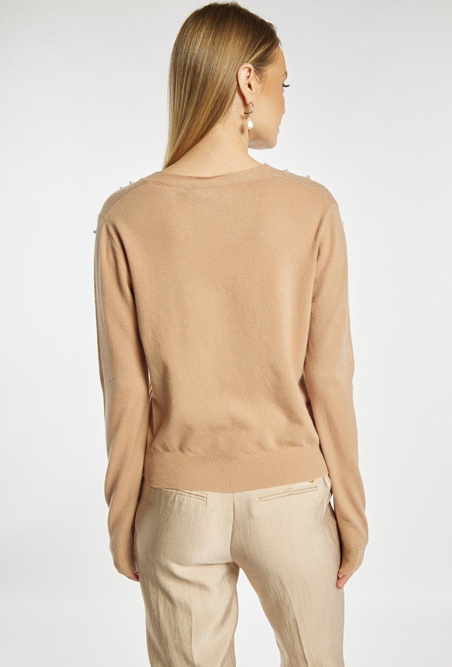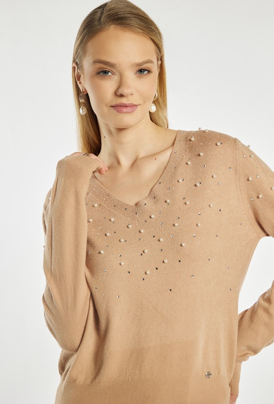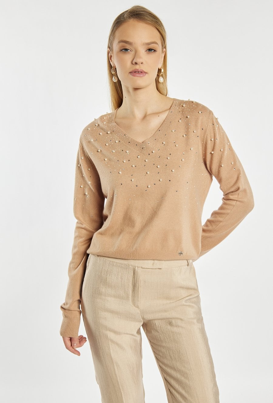 Sweter damski o eleganckim, kobiecym kroju. Model z długim rękawem oraz dekoltem w kształcie litery V, który subtelnie podkreśla linię szyi. Przód ozdobiony jest efektowną aplikacją z drobnych, połyskujących koralików. Damski sweter doskonale sprawdzi się zarówno w codziennych, jak i bardziej eleganckich stylizacjach. Modelka na zdjęciu ma S/M.