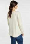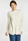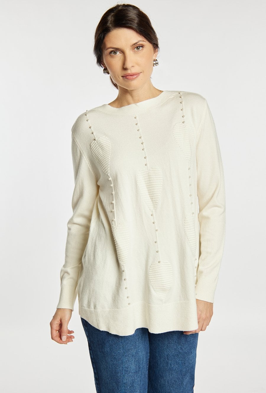 Sweter damski o wydłużonym, luźnym kroju. Model z długim rękawem oraz półokrągłym dekoltem. Przód zdobi dekoracyjny wzór uzupełniony drobnymi koralikami, które nadają całości eleganckiego i kobiecego charakteru. Długi sweter damski doskonale sprawdzi się w codziennych oraz bardziej stylowych stylizacjach. Modelka na zdjęciu ma 177 cm wzrostu i prezentuje rozmiar S/M.