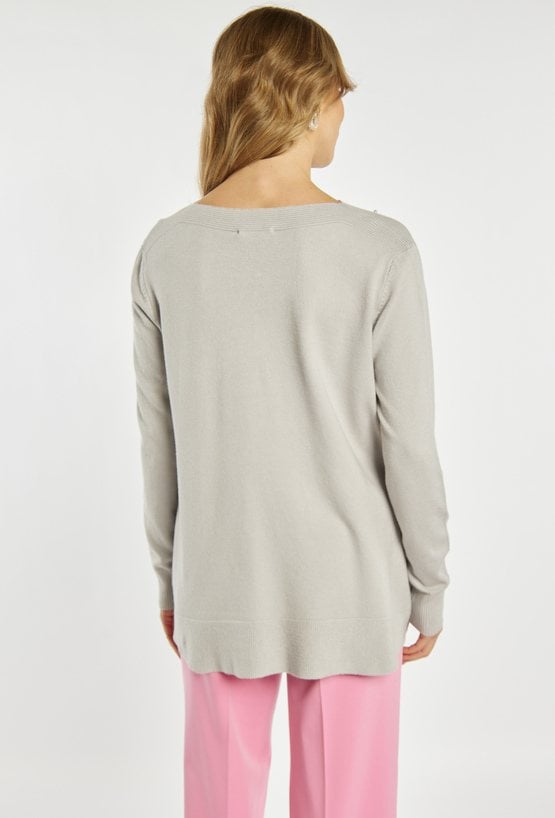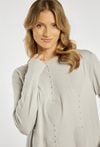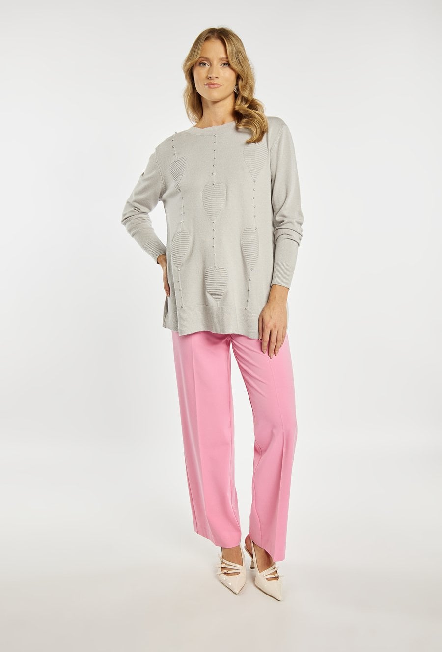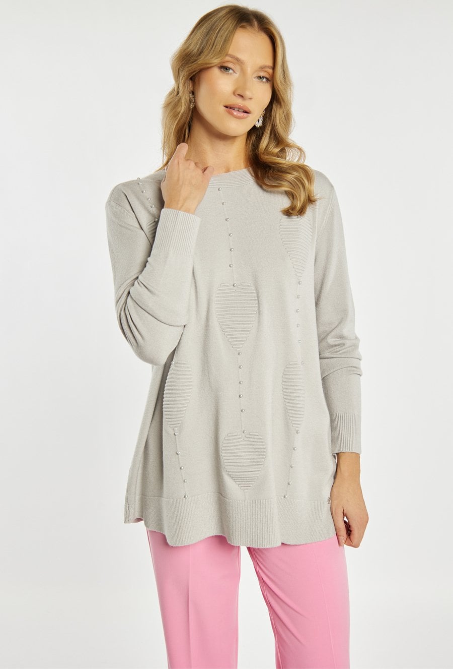 Sweter damski o wydłużonym, luźnym kroju. Model z długim rękawem oraz półokrągłym dekoltem. Przód zdobi dekoracyjny wzór uzupełniony drobnymi koralikami, które nadają całości eleganckiego i kobiecego charakteru. Długi sweter damski doskonale sprawdzi się w codziennych oraz bardziej stylowych stylizacjach. Modelka na zdjęciu ma 177 cm wzrostu i prezentuje rozmiar S/M.