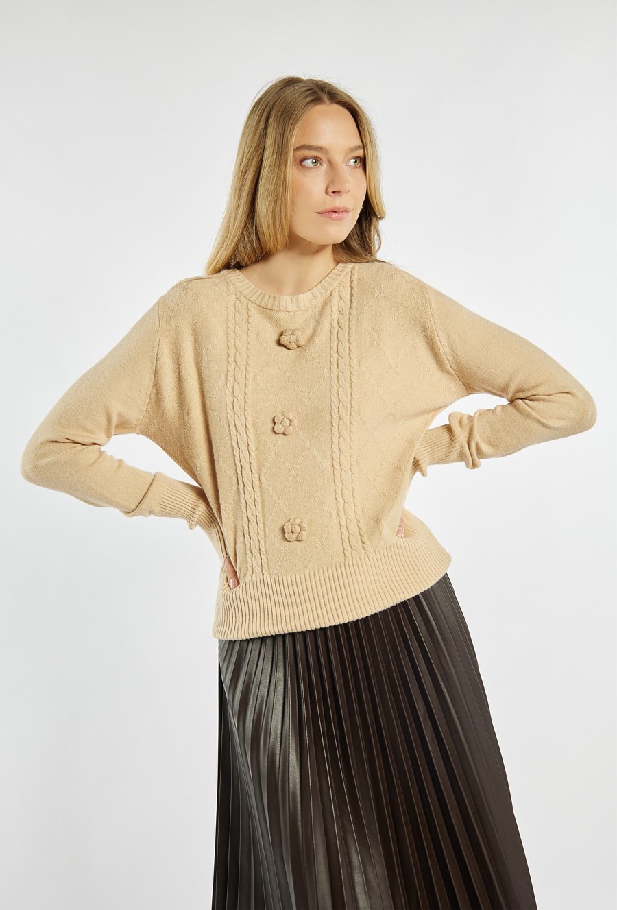 Sweter o klasycznym kroju z ozdobnymi warkoczami i aplikacjami w formie dzianinowych kwiatów z przodu. Rękawy i dół zakończone szerokimi ściągaczami, które nadają całości zgrabny kształt. Idealny wybór na chłodniejsze dni. Modelka na zdjęciu ma 177 cm wzrostu i prezentuje rozmiar S/M.