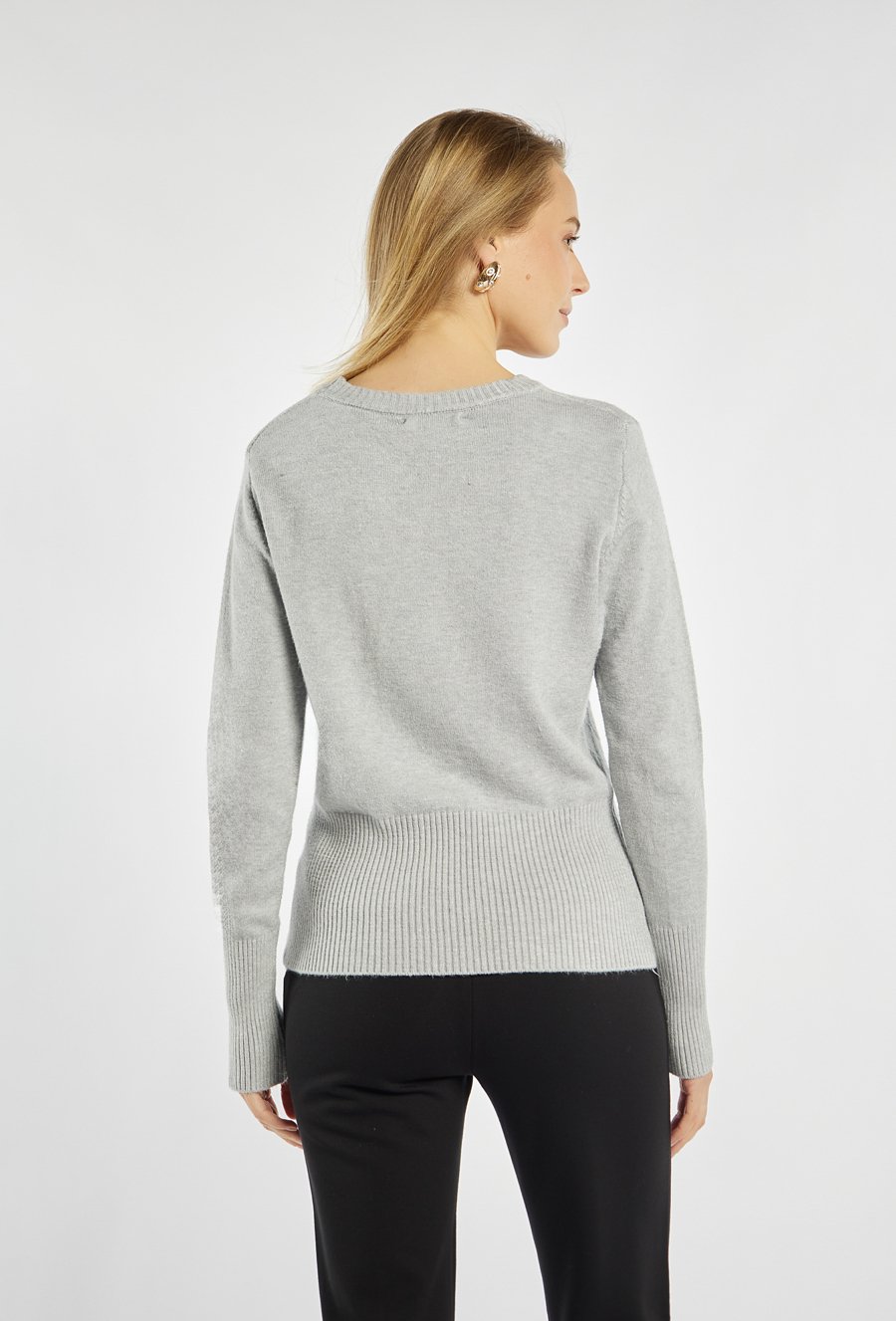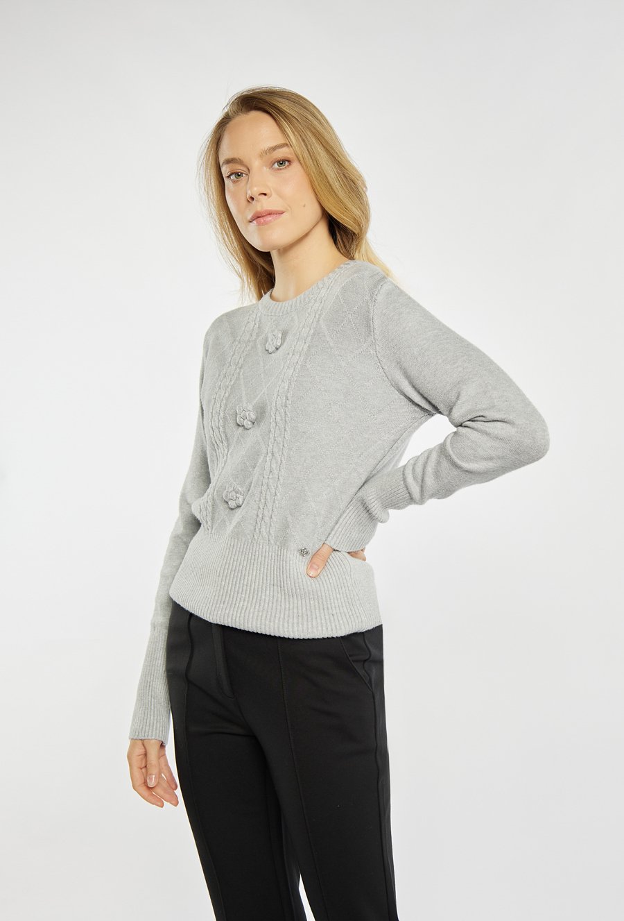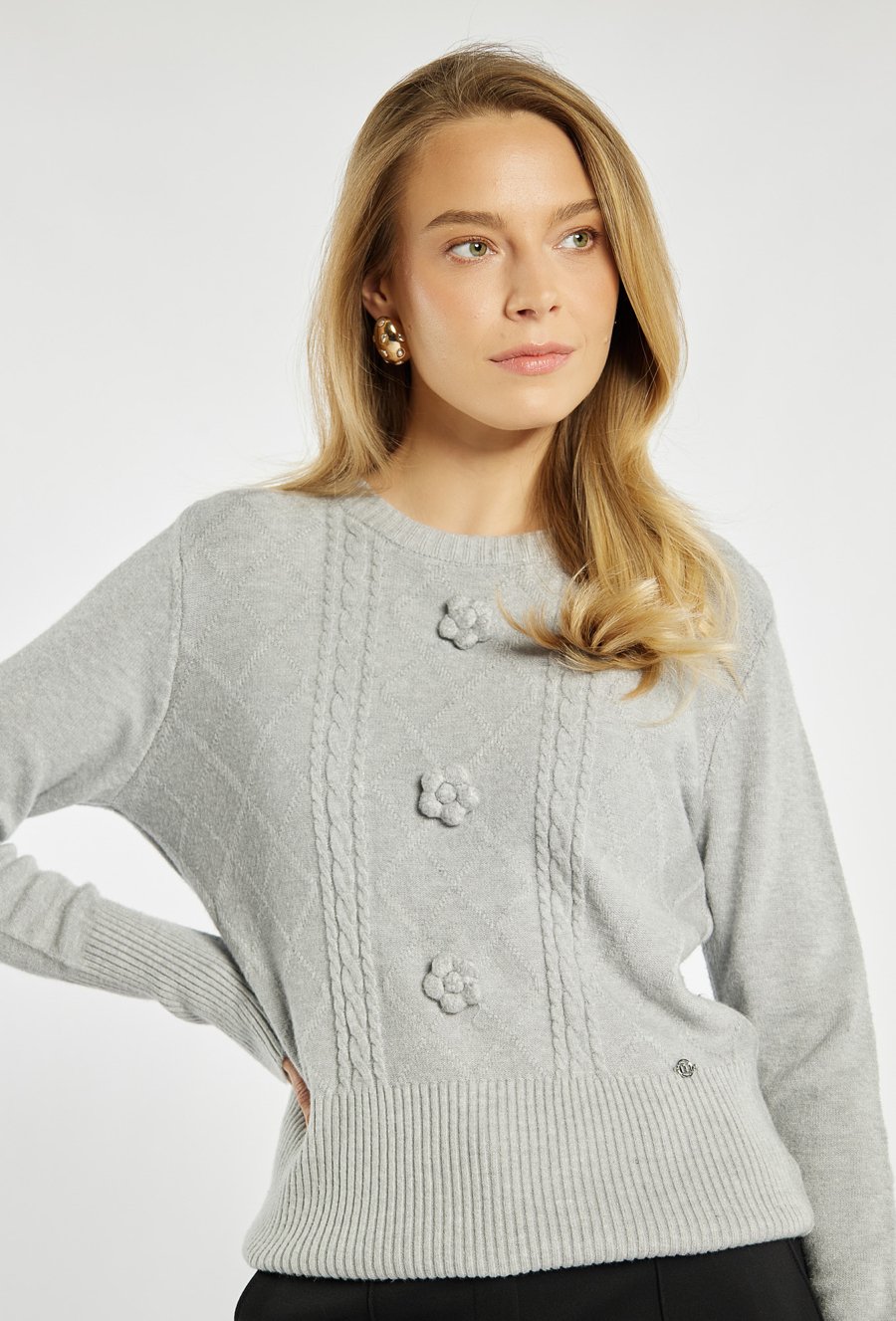 Sweter o klasycznym kroju z ozdobnymi warkoczami i aplikacjami w formie dzianinowych kwiatów z przodu. Rękawy i dół zakończone szerokimi ściągaczami, które nadają całości zgrabny kształt. Idealny wybór na chłodniejsze dni. Modelka na zdjęciu ma 177 cm wzrostu i prezentuje rozmiar S/M.