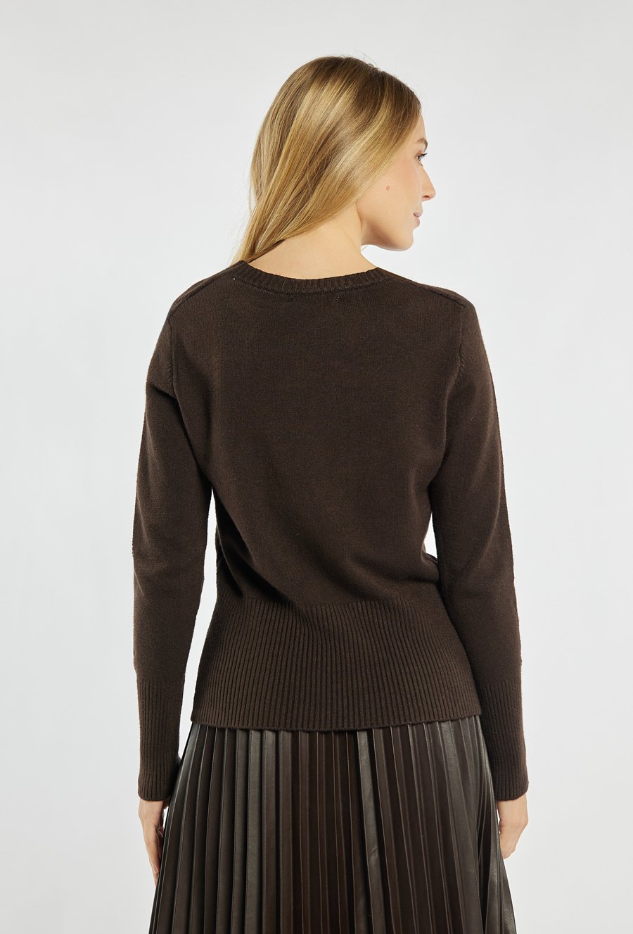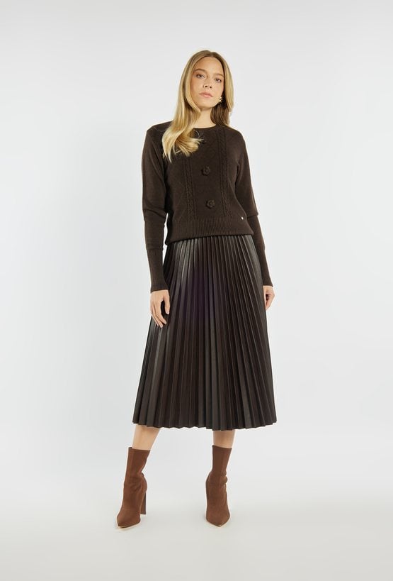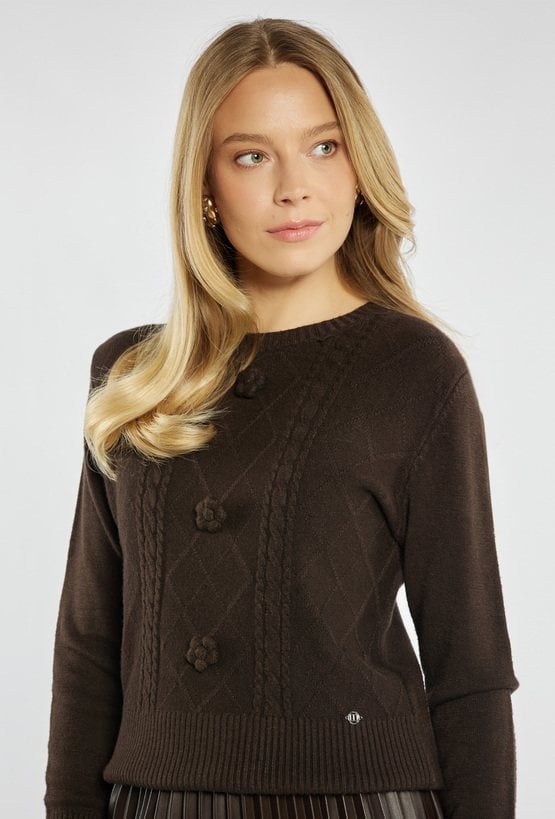 Sweter o klasycznym kroju z ozdobnymi warkoczami i aplikacjami w formie dzianinowych kwiatów z przodu. Rękawy i dół zakończone szerokimi ściągaczami, które nadają całości zgrabny kształt. Idealny wybór na chłodniejsze dni. Modelka na zdjęciu ma 177 cm wzrostu i prezentuje rozmiar S/M.