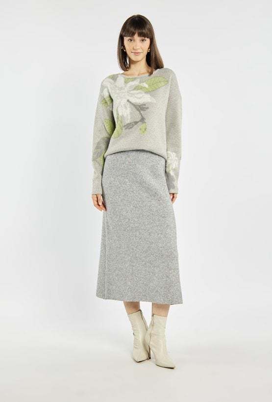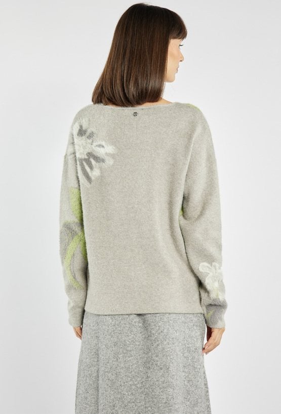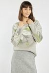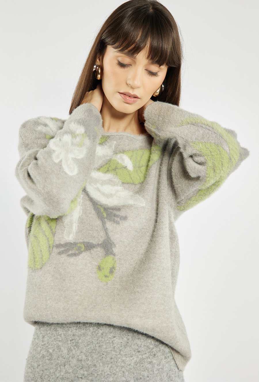 Sweter damski wykonany z przyjemnego materiału. Sweter ozdobiony dużym, kwiatowym motywem z przodu. Luźny krój i okrągły dekolt zapewniają komfort noszenia, a wyrazisty wzór dodaje całości oryginalnego charakteru. Idealny wybór na chłodniejsze dni. Modelka na zdjęciu ma 177 cm wzrostu i prezentuje rozmiar S.