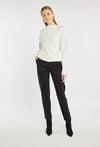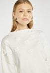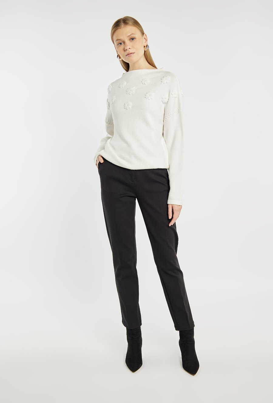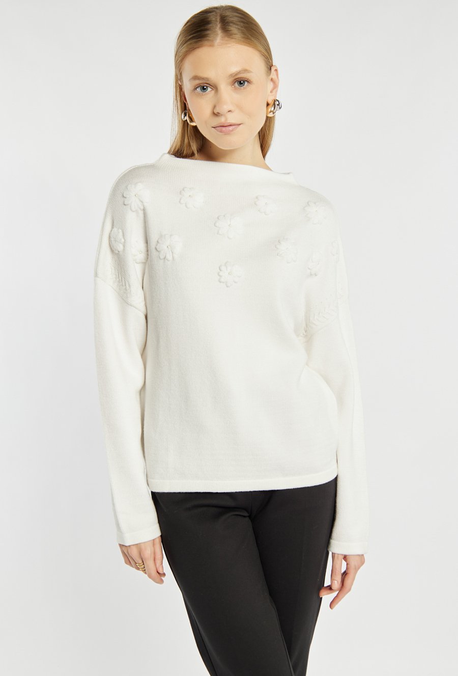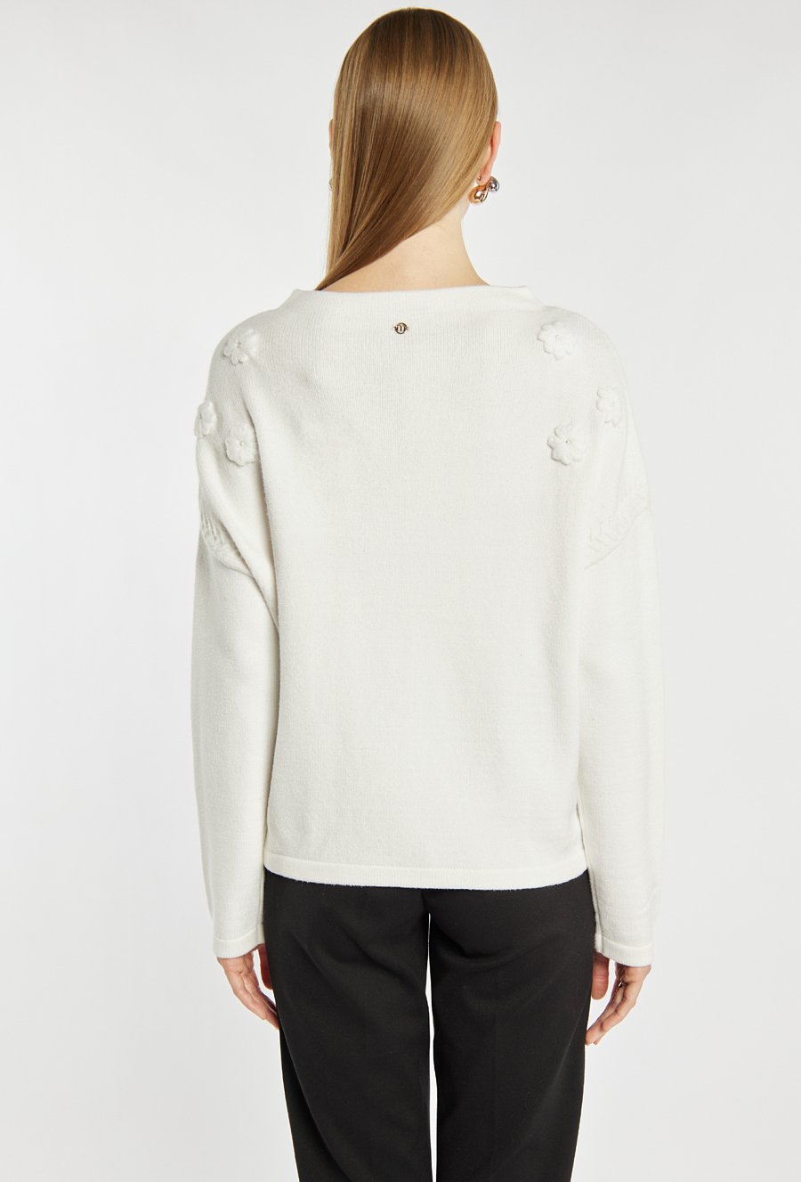 Sweter damski z okrągłym dekoltem i długim rękawem. Utrzymany w minimalistycznym stylu, zdobiony delikatnymi, trójwymiarowymi aplikacjami w formie kwiatowych motywów w górnej części. Idealny do codziennych i bardziej wyjściowych stylizacji. Modelka na zdjęciu ma 177 cm wzrostu i prezentuje rozmiar S.