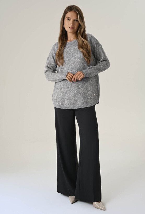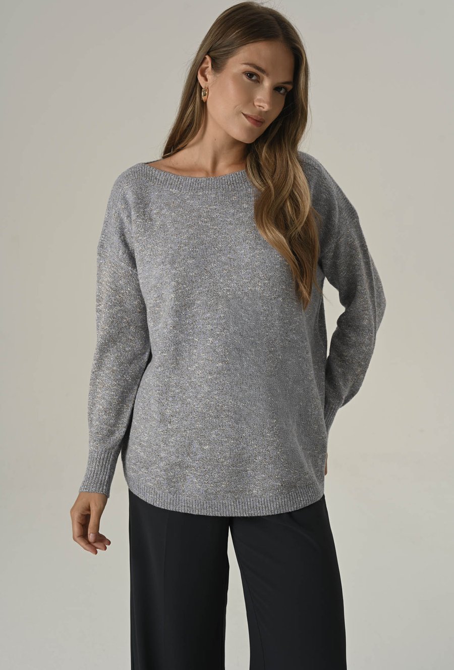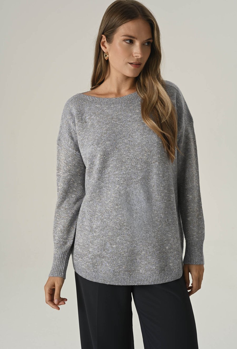 Elegancki sweter damski o klasycznym kroju z delikatnie zaokrąglonym dołem i dekoltem w kształcie łódki. Wykonany z miękkiej, komfortowej przędzy z dodatkiem metalizowanej nici, która dodaje całości subtelnego połysku i wyjątkowego charakteru. Idealny na co dzień, do pracy i na wieczorne wyjścia – stylowy, a zarazem wygodny. Modelka na zdjęciu ma 177 cm wzrostu i prezentuje rozmiar 36/S.