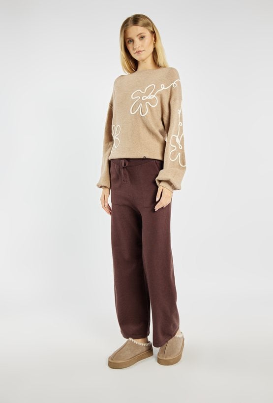 Sweter damski z ozdobnym motywem kwiatowym. Luźniejszy krój oraz obniżona linia ramion nadają mu casualowego charakteru. Stylowy i kobiecy model, który ożywi codzienne stylizacje. Modelka na zdjęciu ma 177 cm wzrostu i prezentuje rozmiar S/M.