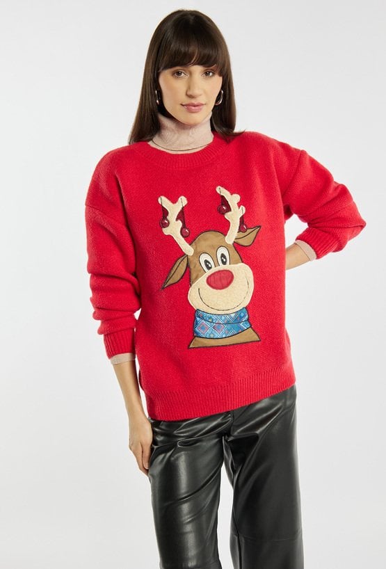 Sweter damski wykonany z miękkiego, przyjemnego w dotyku materiału. Sweter z długimi rękawami i uroczym świątecznym motywem renifera świetnie sprawdzi się w zimowe dni, dodając stylizacjom ciepłego, pogodnego charakteru. Modelka na zdjęciu ma 177 cm wzrostu i prezentuje rozmiar S/M.