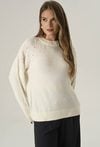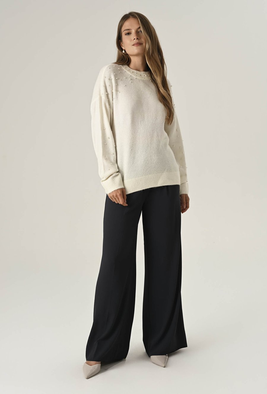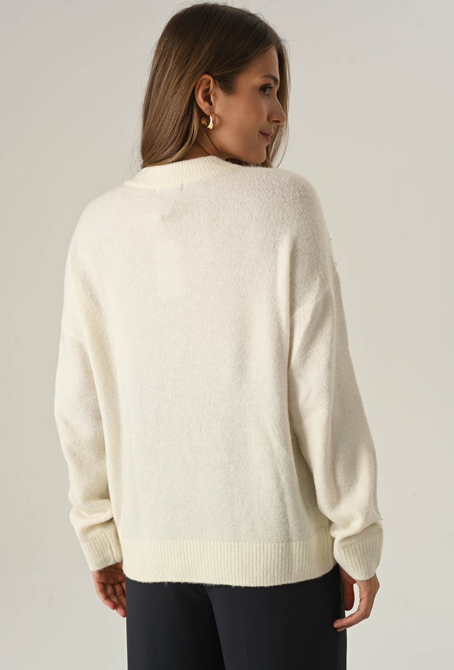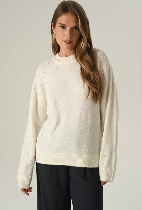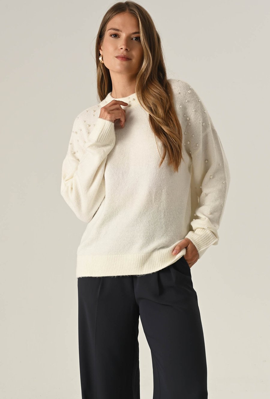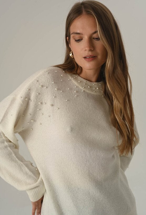 Stylowy sweter damski wykonany z miękkiej, przyjemnej w dotyku przędzy, która zapewnia komfort noszenia przez cały dzień. Model wyróżnia się ozdobnym detalem – subtelnym zdobieniem imitującym perły umieszczonym na półgolfie i ramionach, co dodaje mu elegancji i wyjątkowego charakteru. Klasyczny, okrągły dekolt sprawia, że sweter doskonale układa się na sylwetce i pasuje do wielu stylizacji – od codziennych po bardziej wyjściowe. Modelka na zdjęciu ma 177 cm wzrostu i prezentuje rozmiar 36/S.