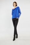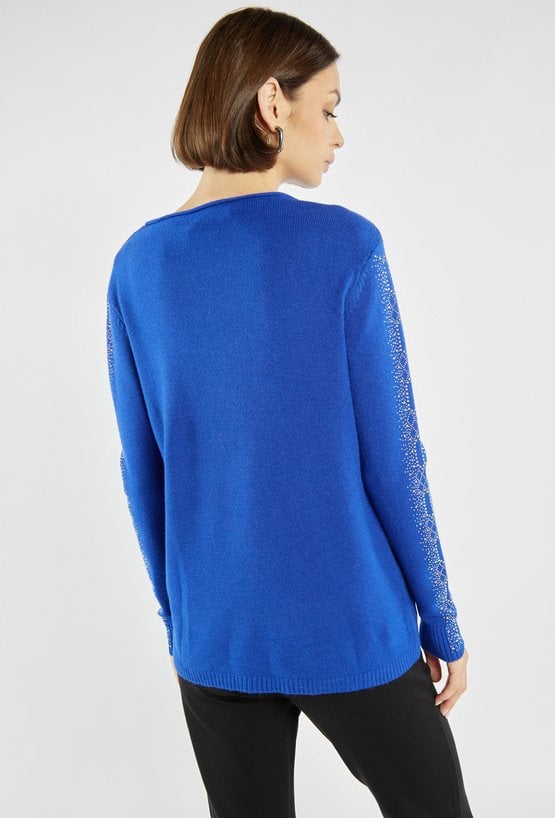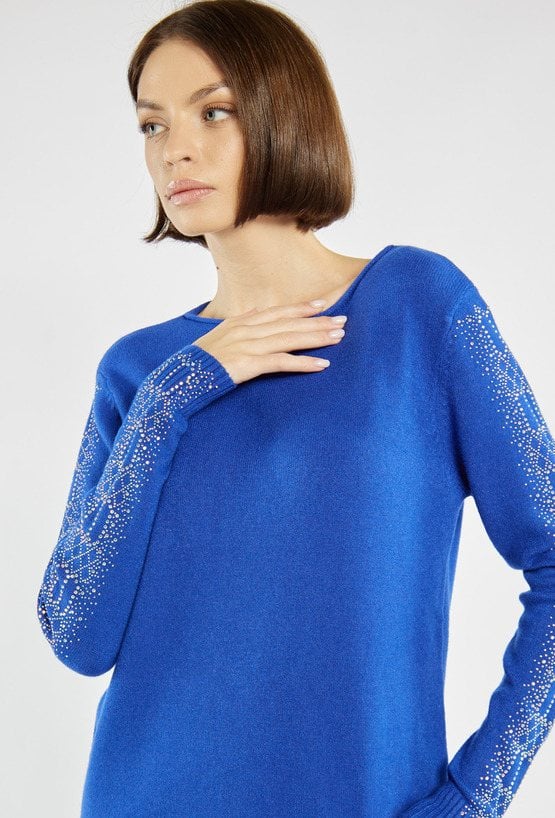 Elegancki sweter damski o klasycznym kroju, ozdobiony efektownymi aplikacjami z drobnych cyrkonii na rękawach. Idealny wybór na wyjątkowe okazje oraz świąteczne stylizacje. Model dostępny w kilku wariantach kolorystycznych. Modelka na zdjęciu ma 177 cm wzrostu i prezentuje rozmiar S/M.
