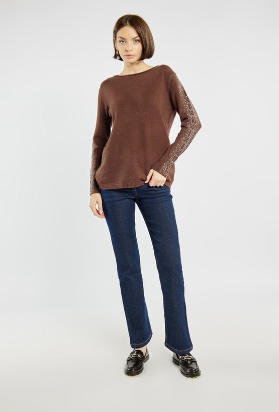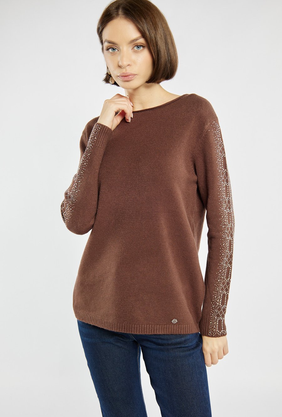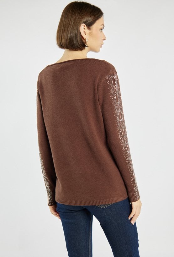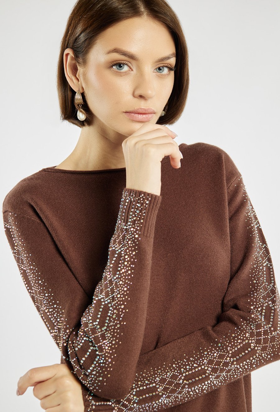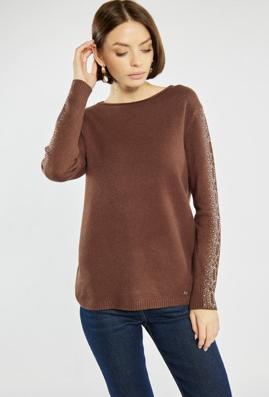 Elegancki sweter damski o klasycznym kroju, ozdobiony efektownymi aplikacjami z drobnych cyrkonii na rękawach. Idealny wybór na wyjątkowe okazje oraz świąteczne stylizacje. Model dostępny w kilku wariantach kolorystycznych. Modelka na zdjęciu ma 177 cm wzrostu i prezentuje rozmiar S/M.