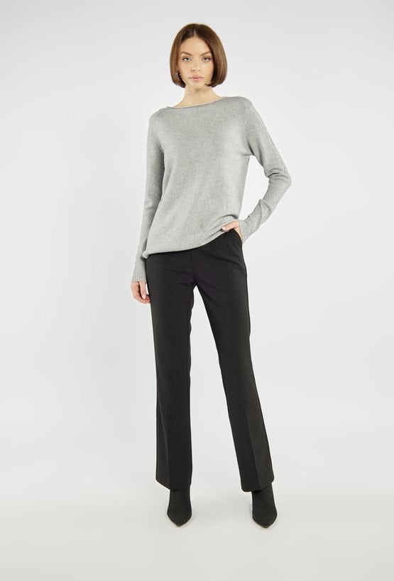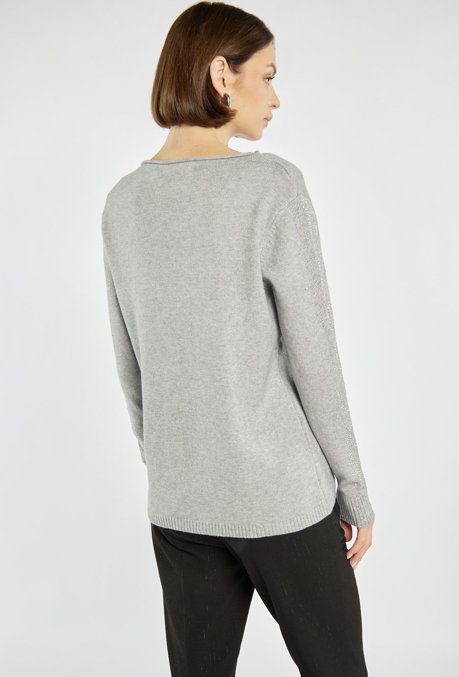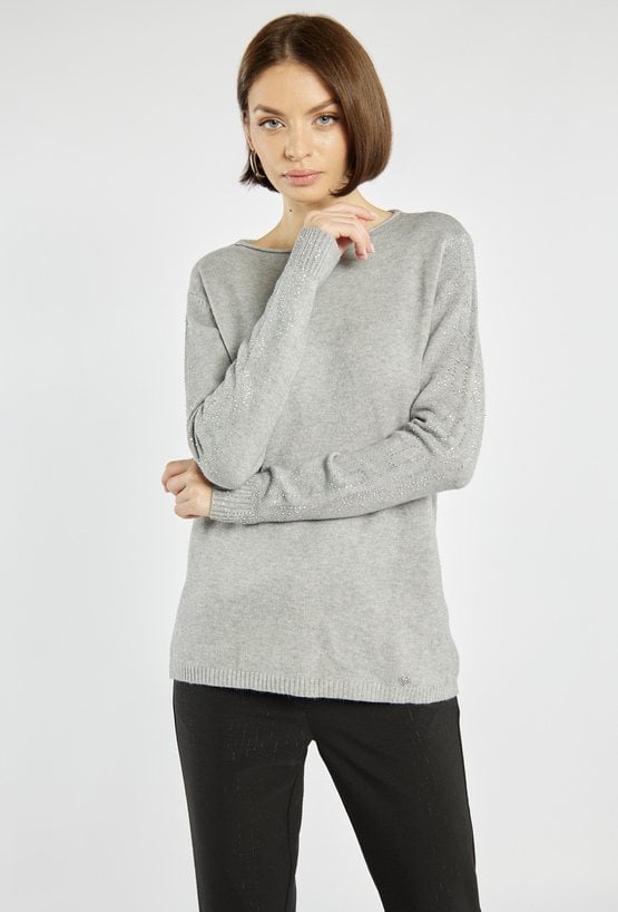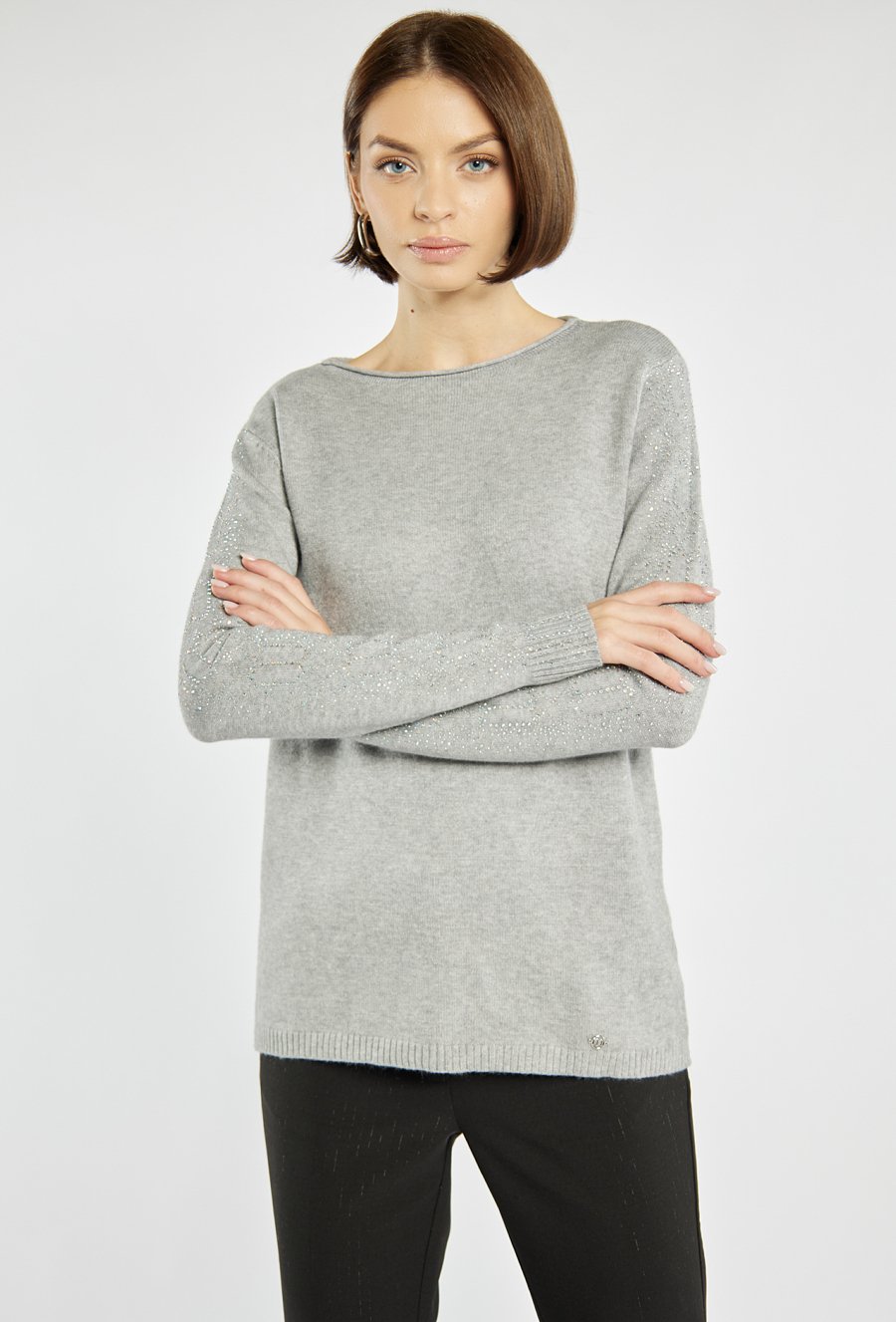 Elegancki sweter damski o klasycznym kroju, ozdobiony efektownymi aplikacjami z drobnych cyrkonii na rękawach. Idealny wybór na wyjątkowe okazje oraz świąteczne stylizacje. Model dostępny w kilku wariantach kolorystycznych. Modelka na zdjęciu ma 177 cm wzrostu i prezentuje rozmiar S/M.