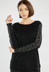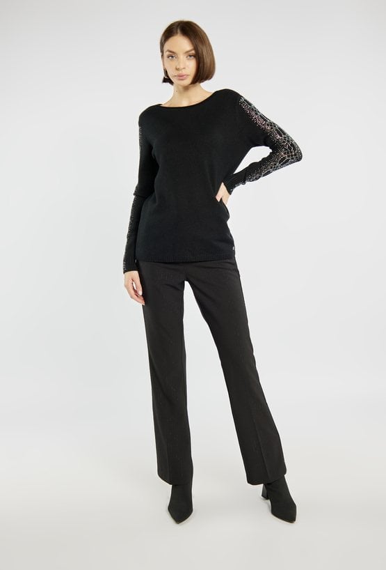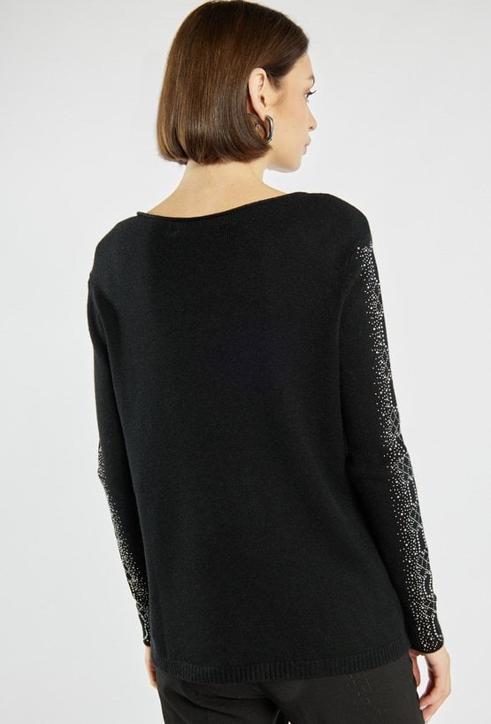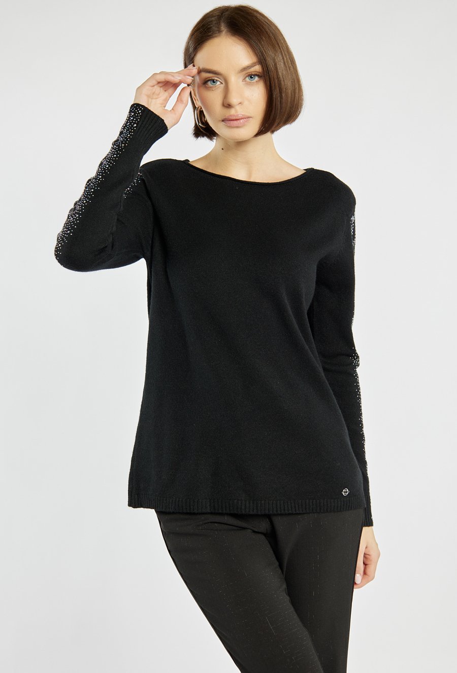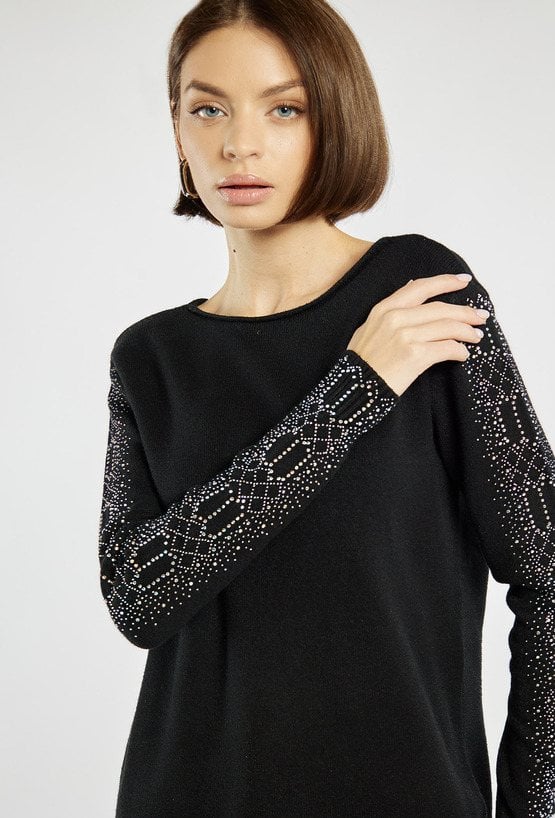 Elegancki sweter damski o klasycznym kroju, ozdobiony efektownymi aplikacjami z drobnych cyrkonii na rękawach. Idealny wybór na wyjątkowe okazje oraz świąteczne stylizacje. Model dostępny w kilku wariantach kolorystycznych. Modelka na zdjęciu ma 177 cm wzrostu i prezentuje rozmiar S/M.