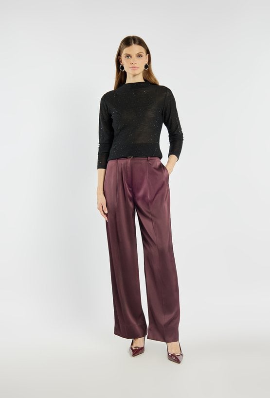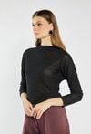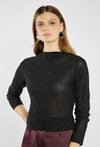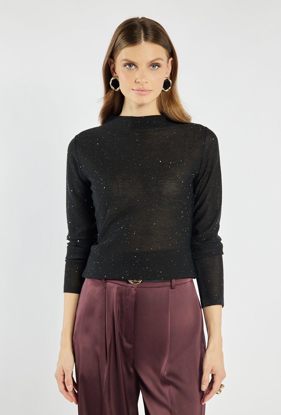 Sweter damski z delikatnym połyskiem, który subtelnie podkreśla kobiecy charakter stylizacji. Dopasowany fason z długim rękawem i półgolfem doskonale układa się na sylwetce. Model idealny na chłodniejsze dni jesieni i zimy. Modelka na zdjęciu ma 177 cm wzrostu i prezentuje rozmiar S.