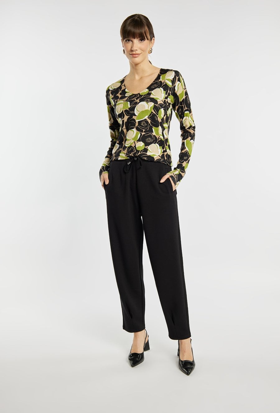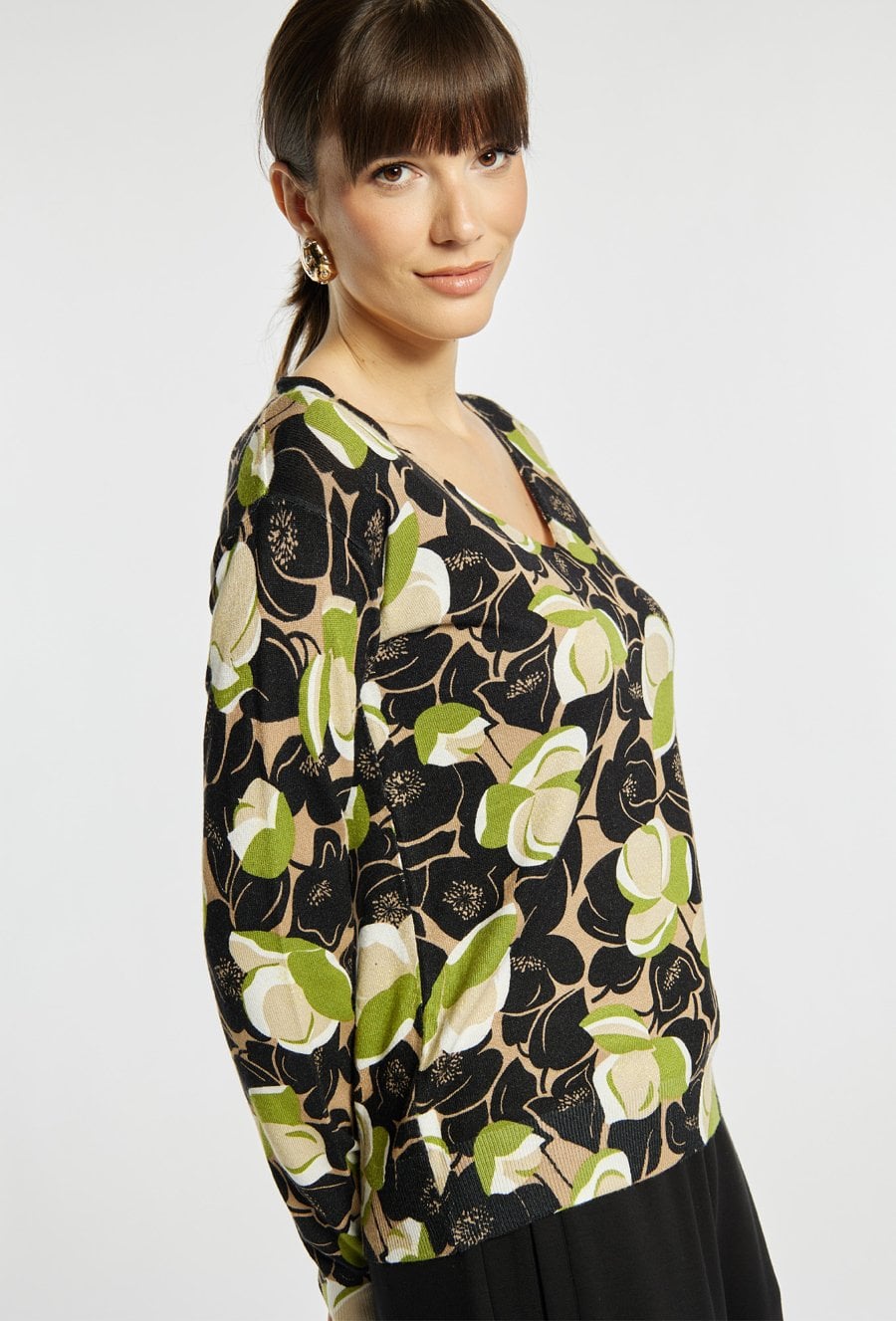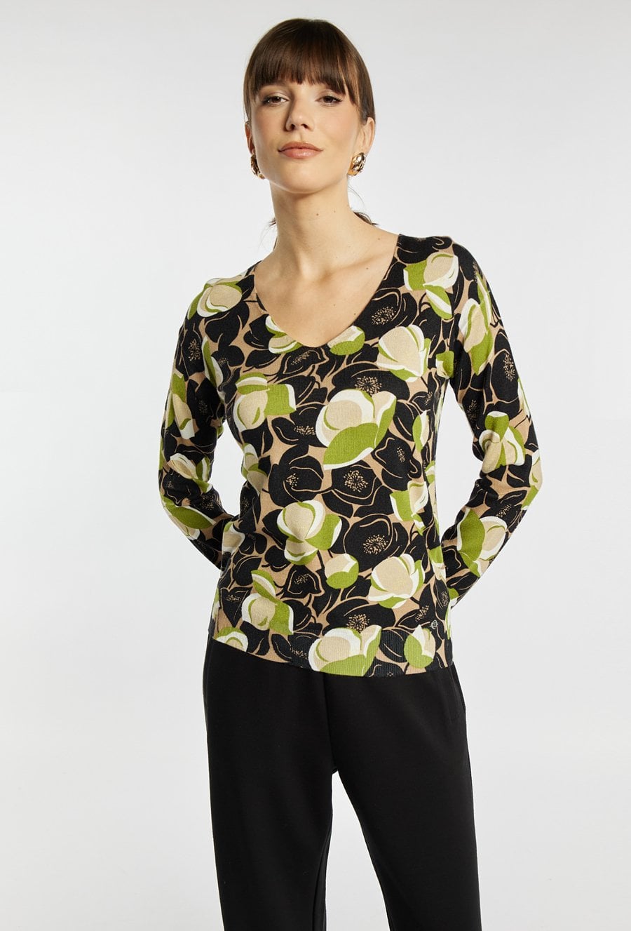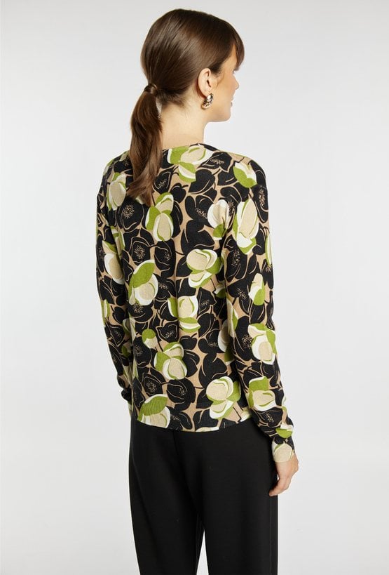 Sweter o kobiecym kroju to delikatna i stylowa propozycja na co dzień. Sweter z dekoltem w serek i długimi rękawami zachwyca subtelnym kwiatowym wzorem. Modelka na zdjęciu ma 177 cm wzrostu i prezentuje rozmiar S.