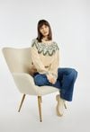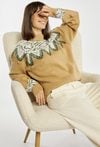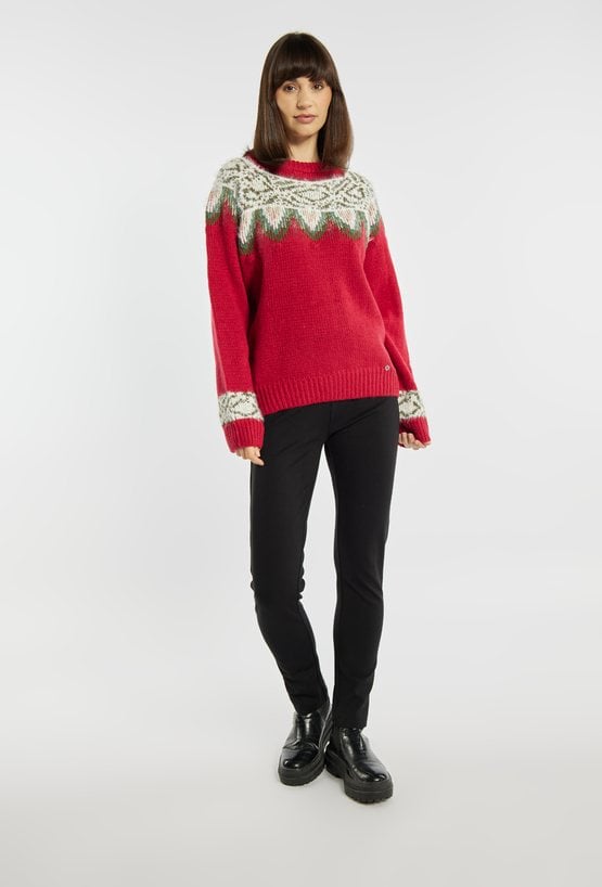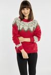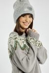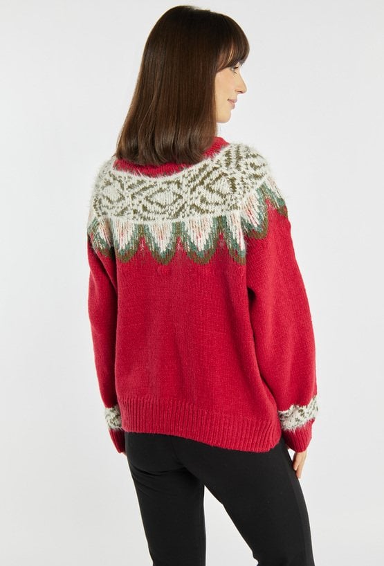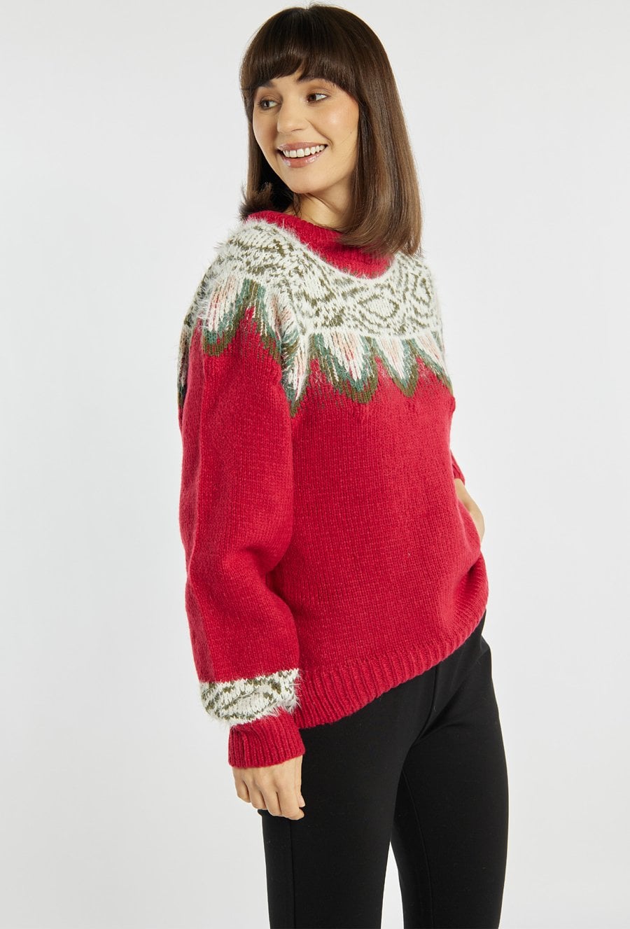 Sweter damski w świątecznym stylu, idealny na zimowy okres. Sweter z długimi rękawami, półokrągłym dekoltem i dekoracyjnym wzorem dodaje stylizacjom przytulnego, sezonowego charakteru. Model dostępny jest w kilku wariantach kolorystycznych. Modelka na zdjęciu ma 177 cm wzrostu i prezentuje rozmiar S/M.