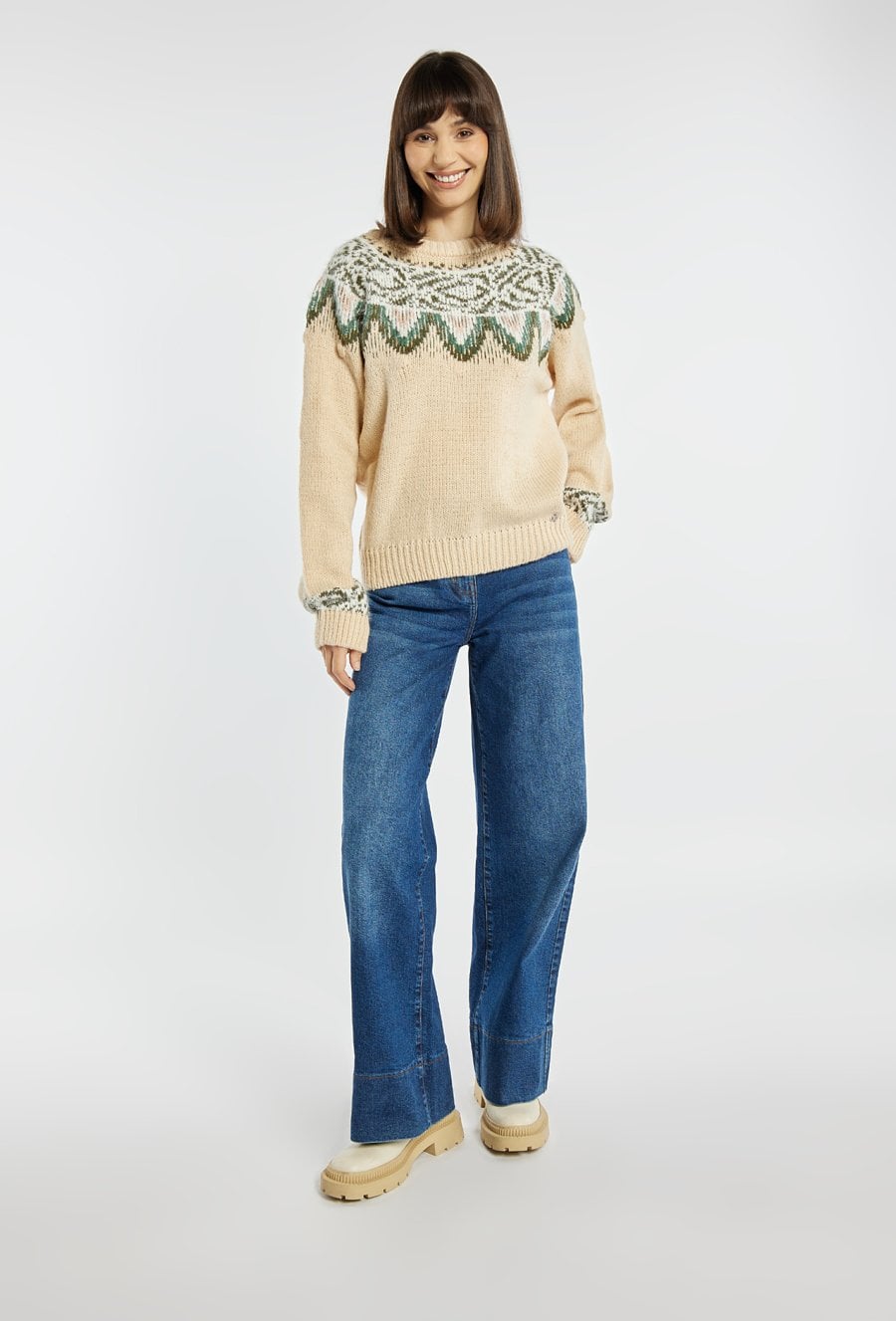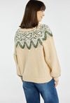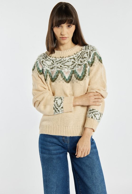 Sweter damski w świątecznym stylu, idealny na zimowy okres. Sweter z długimi rękawami, półokrągłym dekoltem i dekoracyjnym wzorem dodaje stylizacjom przytulnego, sezonowego charakteru. Model dostępny jest w kilku wariantach kolorystycznych. Modelka na zdjęciu ma 177 cm wzrostu i prezentuje rozmiar S/M.