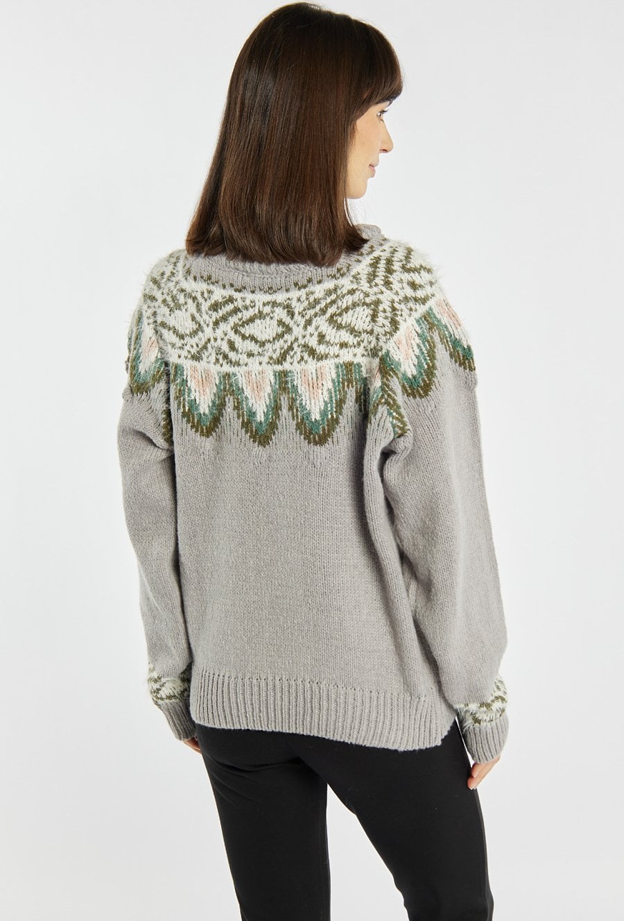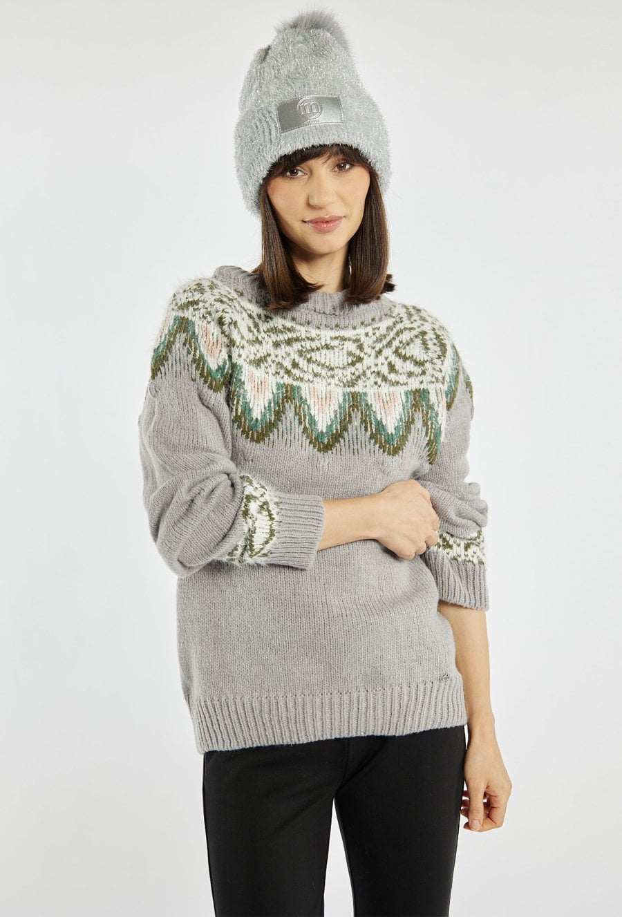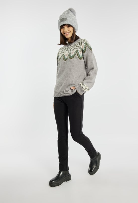 Sweter damski w świątecznym stylu, idealny na zimowy okres. Sweter z długimi rękawami, półokrągłym dekoltem i dekoracyjnym wzorem dodaje stylizacjom przytulnego, sezonowego charakteru. Model dostępny jest w kilku wariantach kolorystycznych. Modelka na zdjęciu ma 177 cm wzrostu i prezentuje rozmiar S/M.