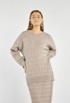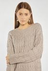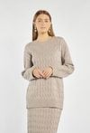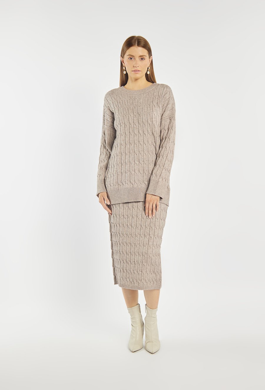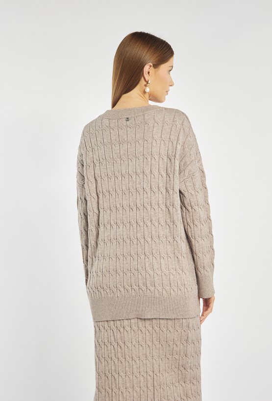 Sweter damski o klasycznym kroju z wyrazistym splotem warkoczowym. Sweter okrągłym dekoltem i długim rękawem, idealny na chłodniejsze dni. Polecamy w komplecie ze spódnicą z tej samej kolekcji. Kod do spódnicy: 25Z-SKR0840. Modelka na zdjęciu ma 177 cm wzrostu i prezentuje rozmiar S.