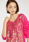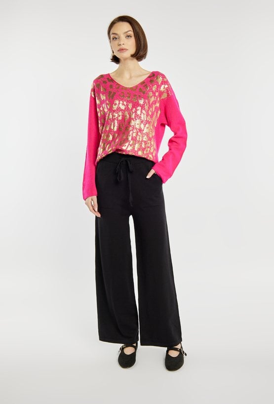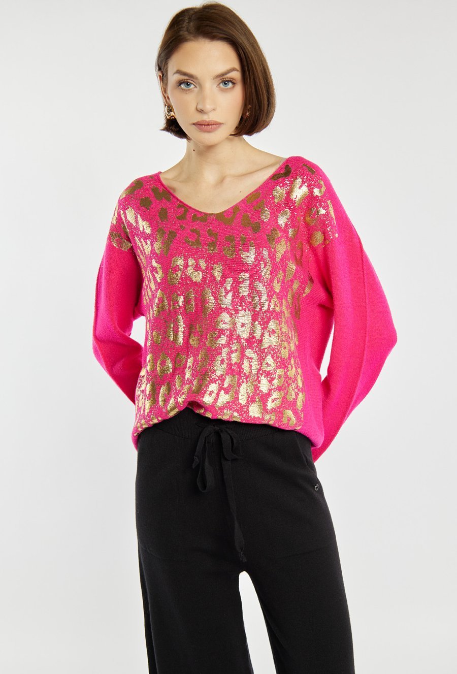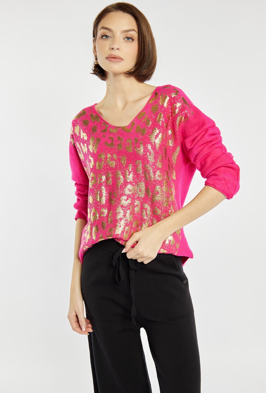 Sweter z efektownym, połyskującym nadrukiem w zwierzęcy wzór, który nadaje całości wyrazistego charakteru. Sweter z okrągłym dekoltem doskonale sprawdzi się zarówno w eleganckich, jak i bardziej casualowych stylizacjach. Model ten zapewnia komfort i styl przez cały dzień. Modelka na zdjęciu ma 177 cm wzrostu i prezentuje rozmiar S/M.